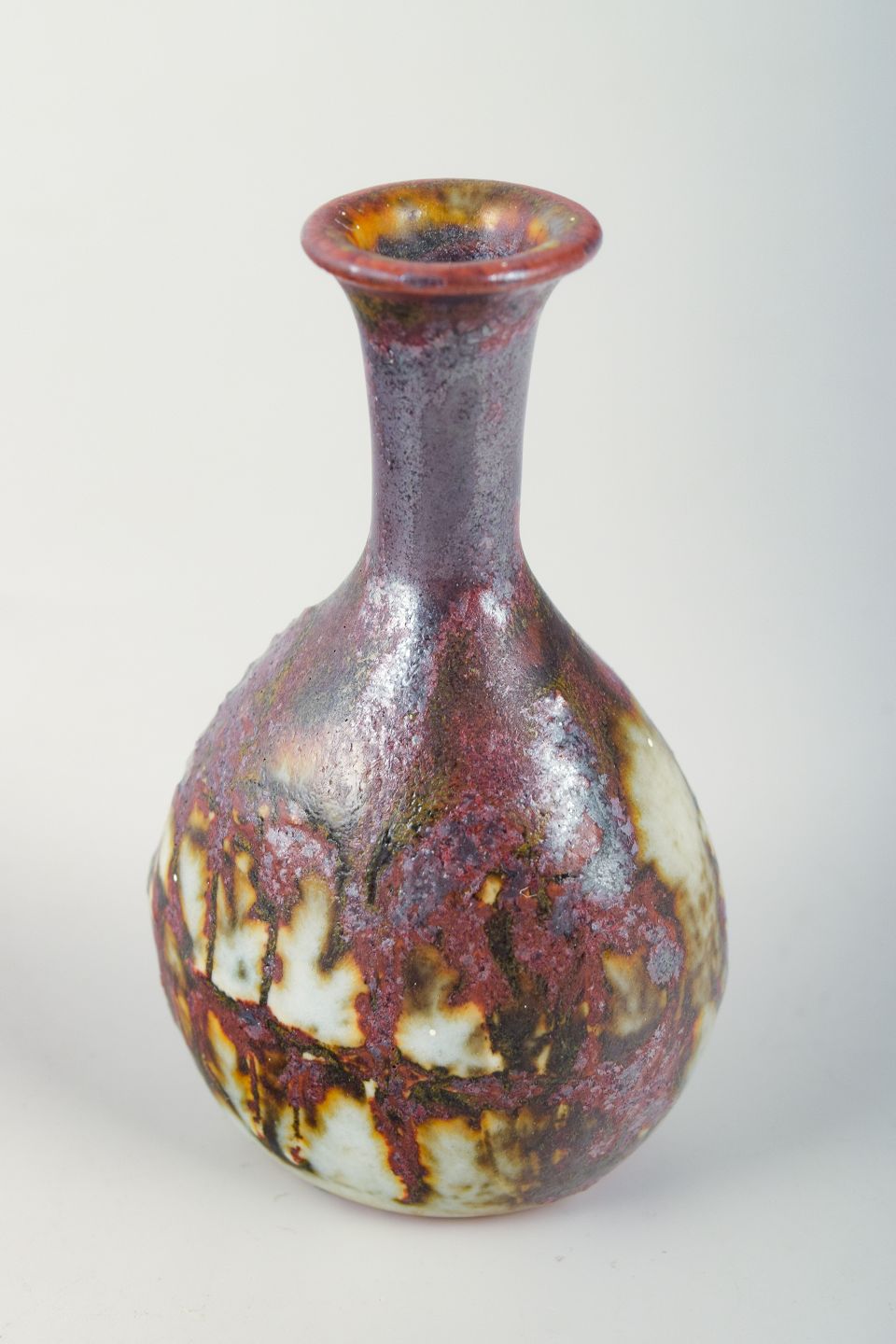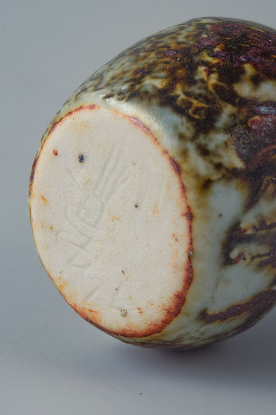 Stig Lindberg studiofremstillet miniaturevase i stentøj med flerfarvet glasur i røde, lilla, brune og cremefarvede nuancer, dekoreret med tekstureret overflade.