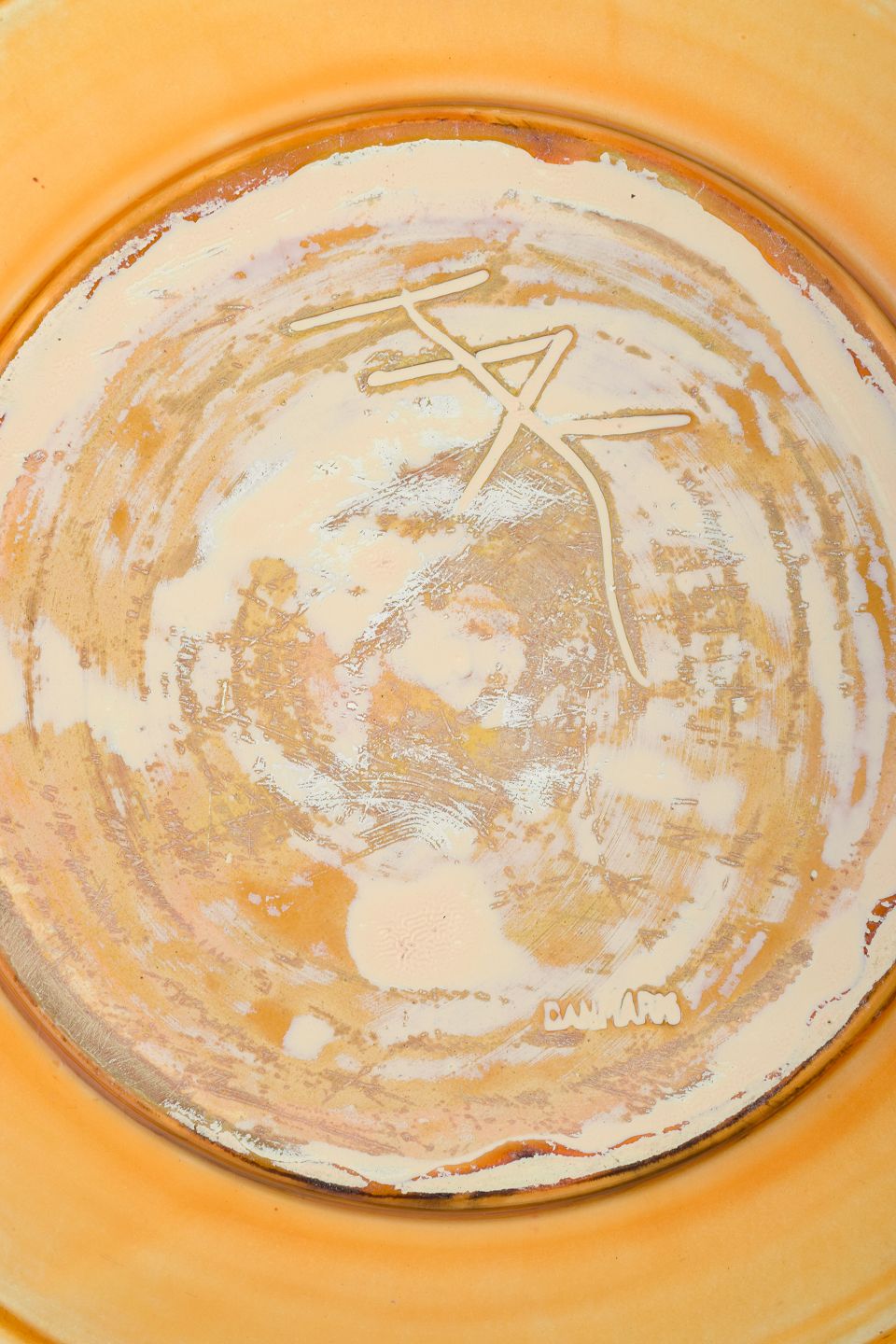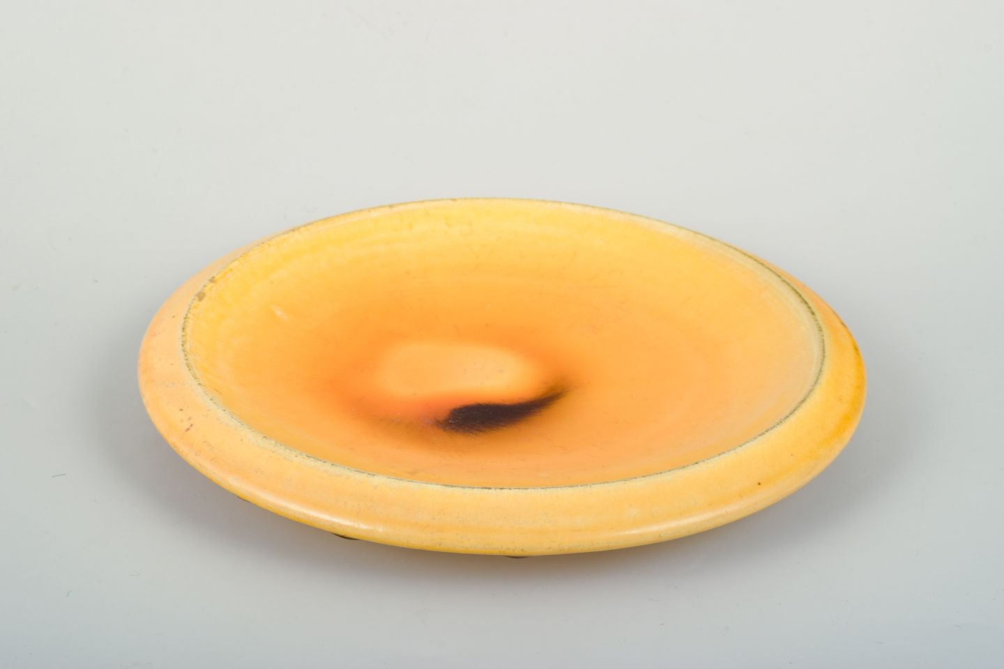Lille, lavt fad designet af Svend Hammershøi for Kähler, udført i 1930’erne. Glaseret i varme gule og brune nuancer med let spil i overfladen, der fremhæver den enkle, funktionelle form. Den lave profil gør fadet velegnet både som serverings- og dekorationselement.