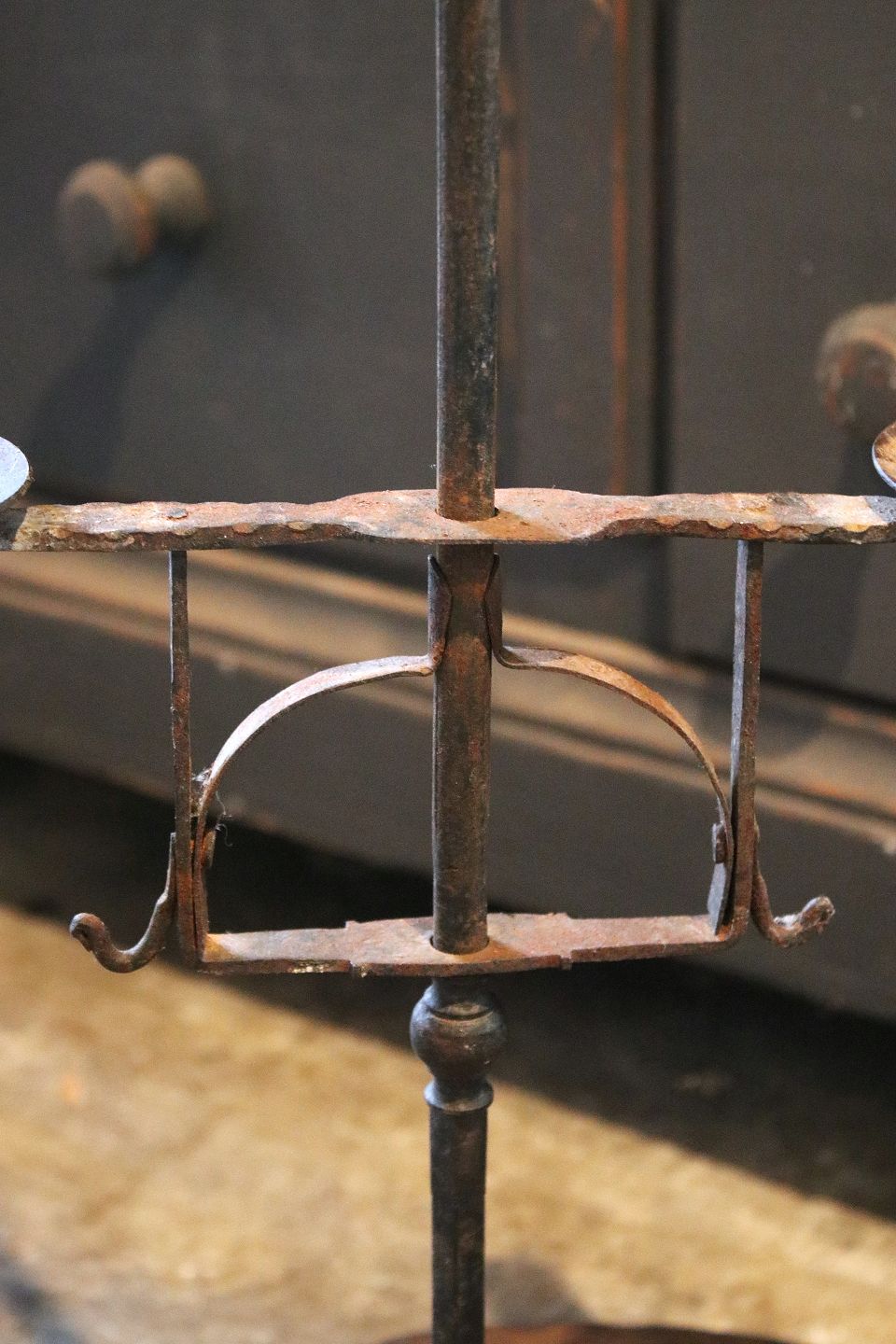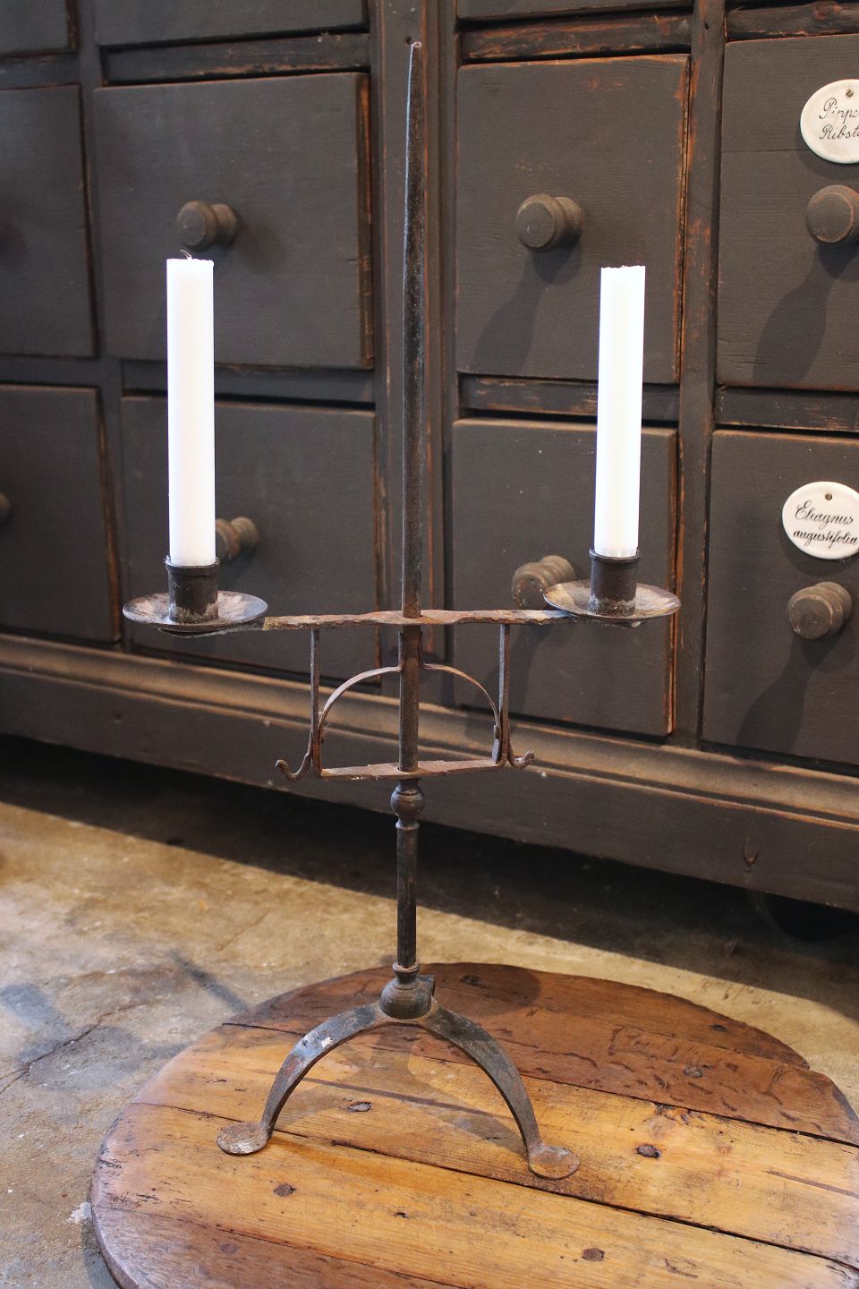 Gammel svensk lysestage i sort smedejern til 2 alm. stearinlys med en rigtig fin patina. H: 58cm. B: 30cm.