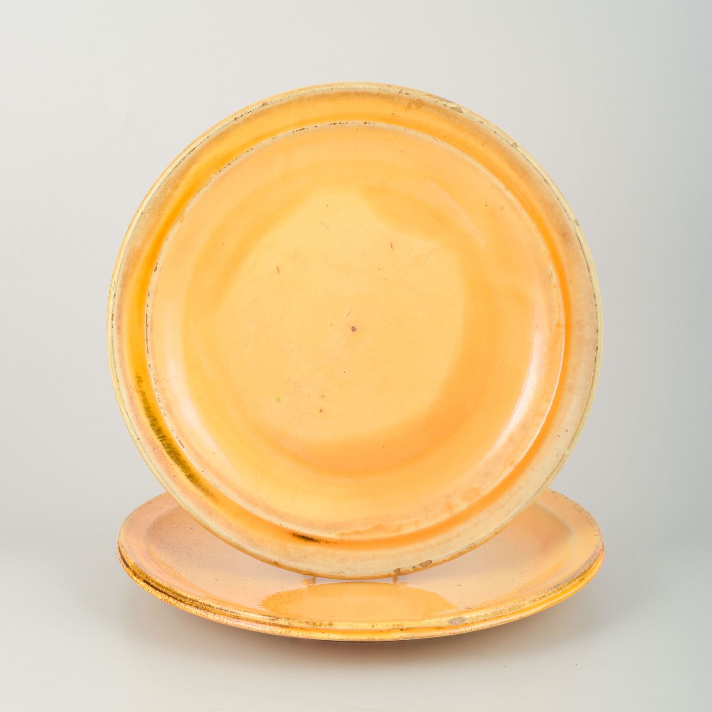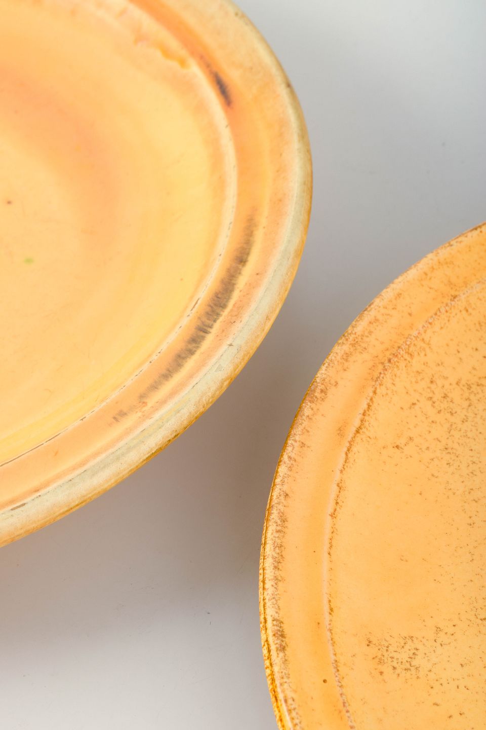 To lave fade designet af Svend Hammershøi for Kähler, udført i 1930’erne. Glaseret i varme gule og brune nuancer med lette variationer i overfladen, som fremhæver den enkle, funktionelle form. Den lave profil gør fadene velegnede både som serverings- og dekorationselementer.