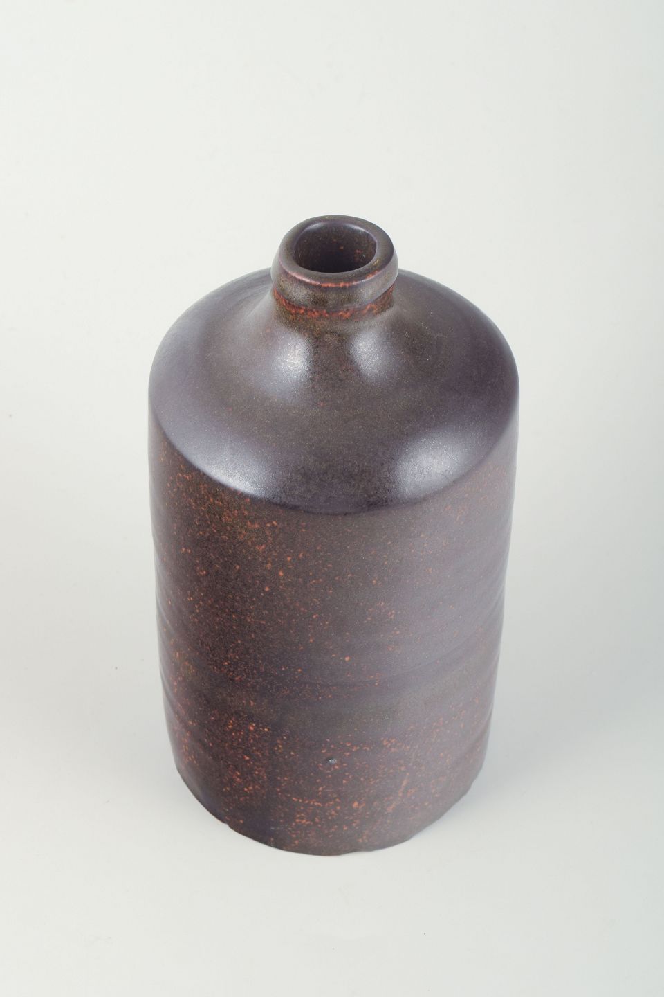 Høj, cylindrisk vase med let indsnævret hals, fremstillet af en europæisk studiokeramiker, formentlig i midten af 1900-tallet. Glasuren er udført i dyb violet med rødlige nuancer, som skaber en levende, næsten metallisk overflade. Et enkelt formsprog, hvor proportionerne understøtter glasurens stoflige virkning.