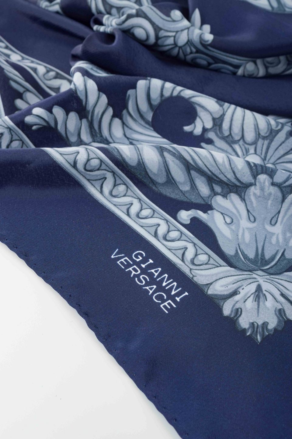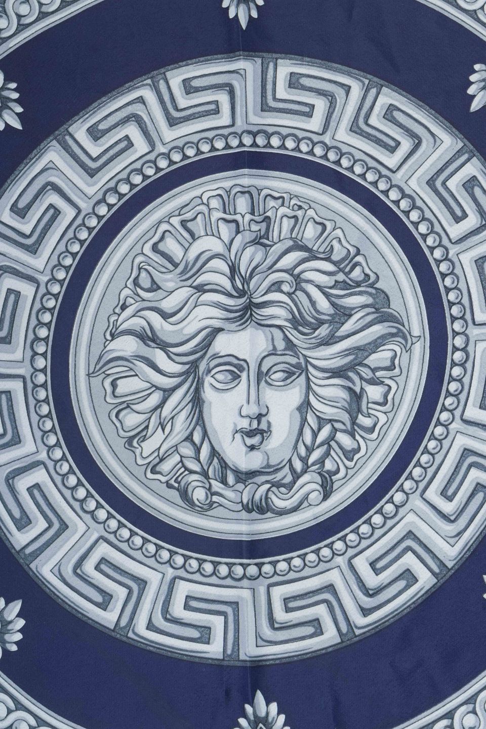 Eksklusivt tørklæde i ren silke fra Gianni Versace. Dekoreret i klassisk blå med det ikoniske Medusa-motiv i midten, omgivet af ornamentale borter og akantusranker i grå nuancer. Et raffineret design, der kombinerer antikkens æstetik med Versaces karakteristiske luksuriøse formsprog.