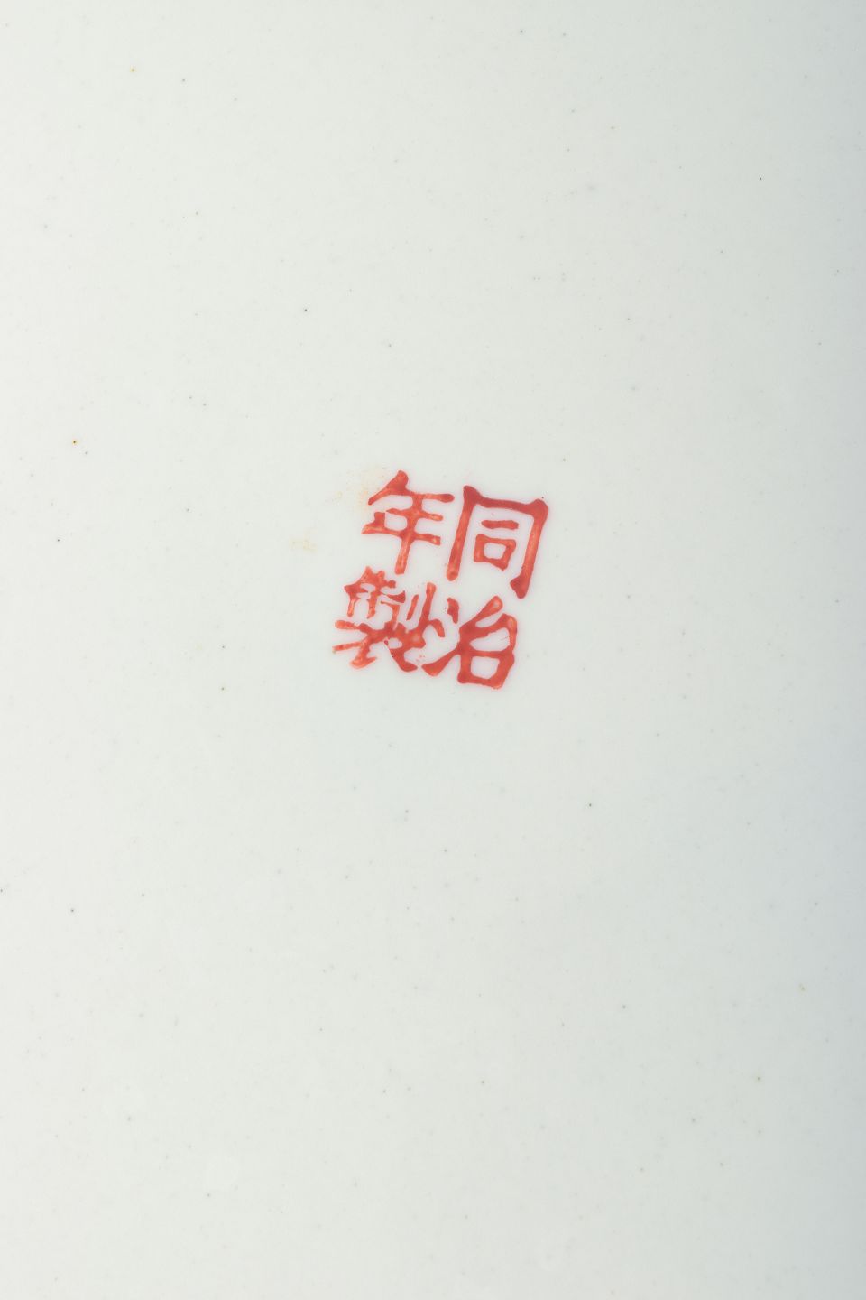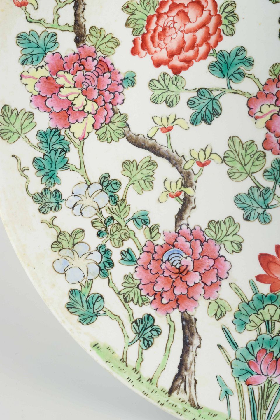 Stor porcelænsskål dekoreret i famille rose med blomstrende pæoner, krysantemum, lotus og blomstrende grene i flerfarvede nuancer af rød, grøn, pink og turkis. Underglasuret hvid baggrund. På bunden rødt seks-tegns mærke “Tongzhi nian zhi” (fremstillet i Tongzhi-perioden).