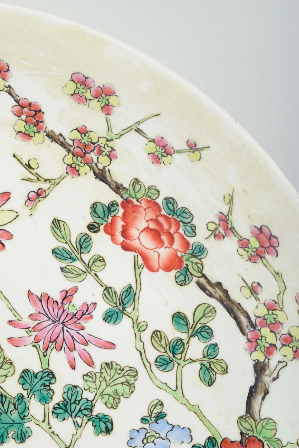 En dekorativ og stor skål, der med sit rige blomsterregister repræsenterer Qing-dynastiets sans for farvepragt og symbolik, hvor blomsterne står for velstand, harmoni og lang levetid.
