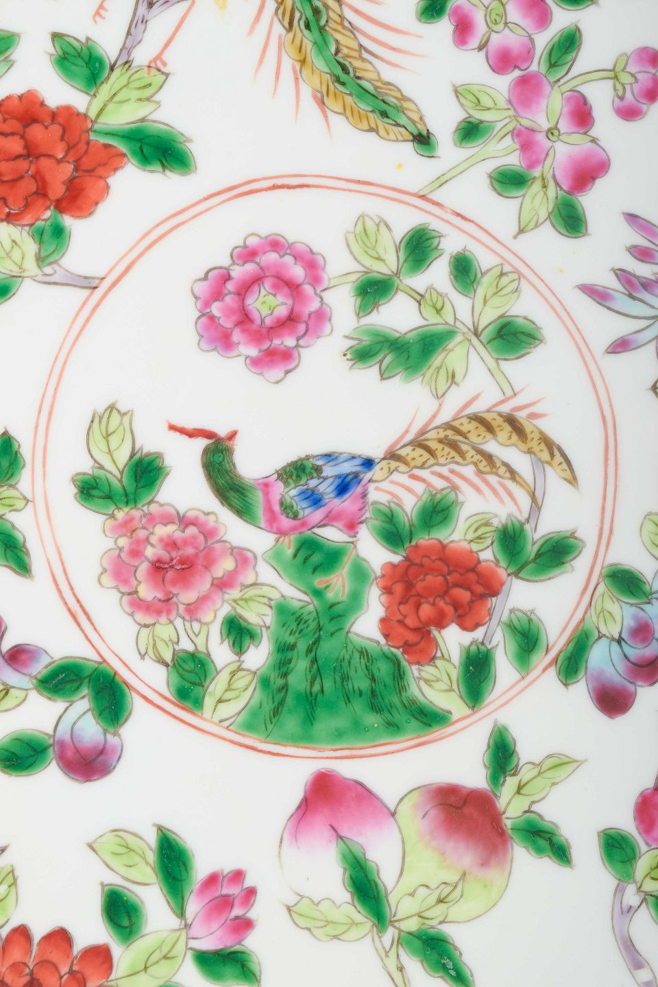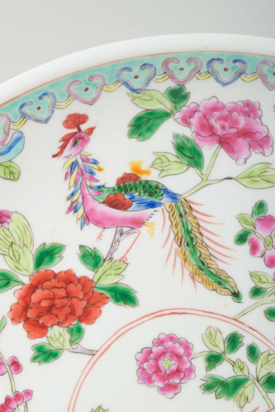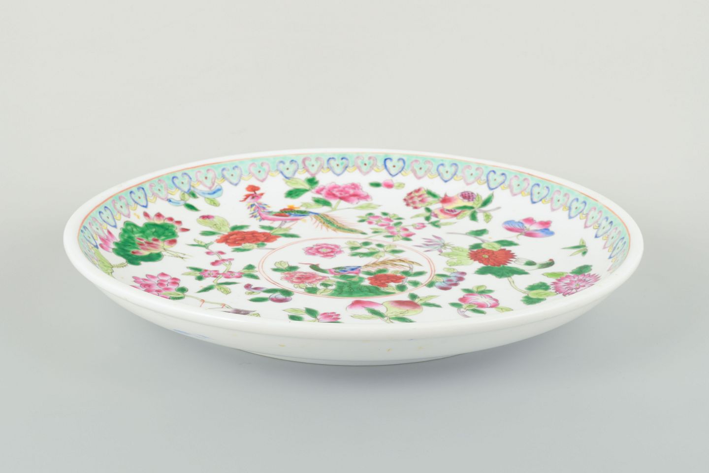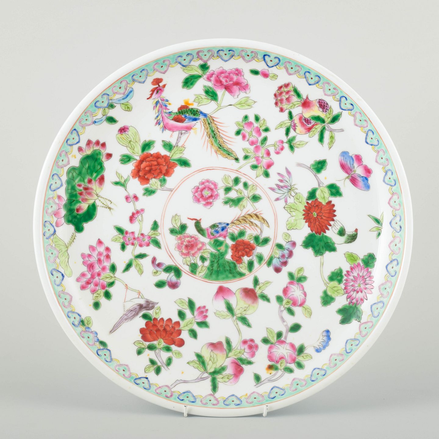 Stort fad i porcelæn, dekoreret med blomster, frugter og fugle i flerfarvet emalje (famille rose).