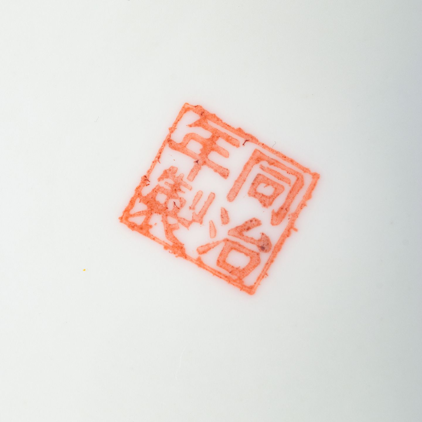 Stort fad i porcelæn, dekoreret med blomster, frugter og fugle i flerfarvet emalje (famille rose). Midtfeltet med hane blandt blomstrende pæoner, symbol på velstand og fornyelse. Randen med ornamentbort i polykrom dekoration. Undersiden mærket med rødt seks-tegns Tongzhi-mærke.