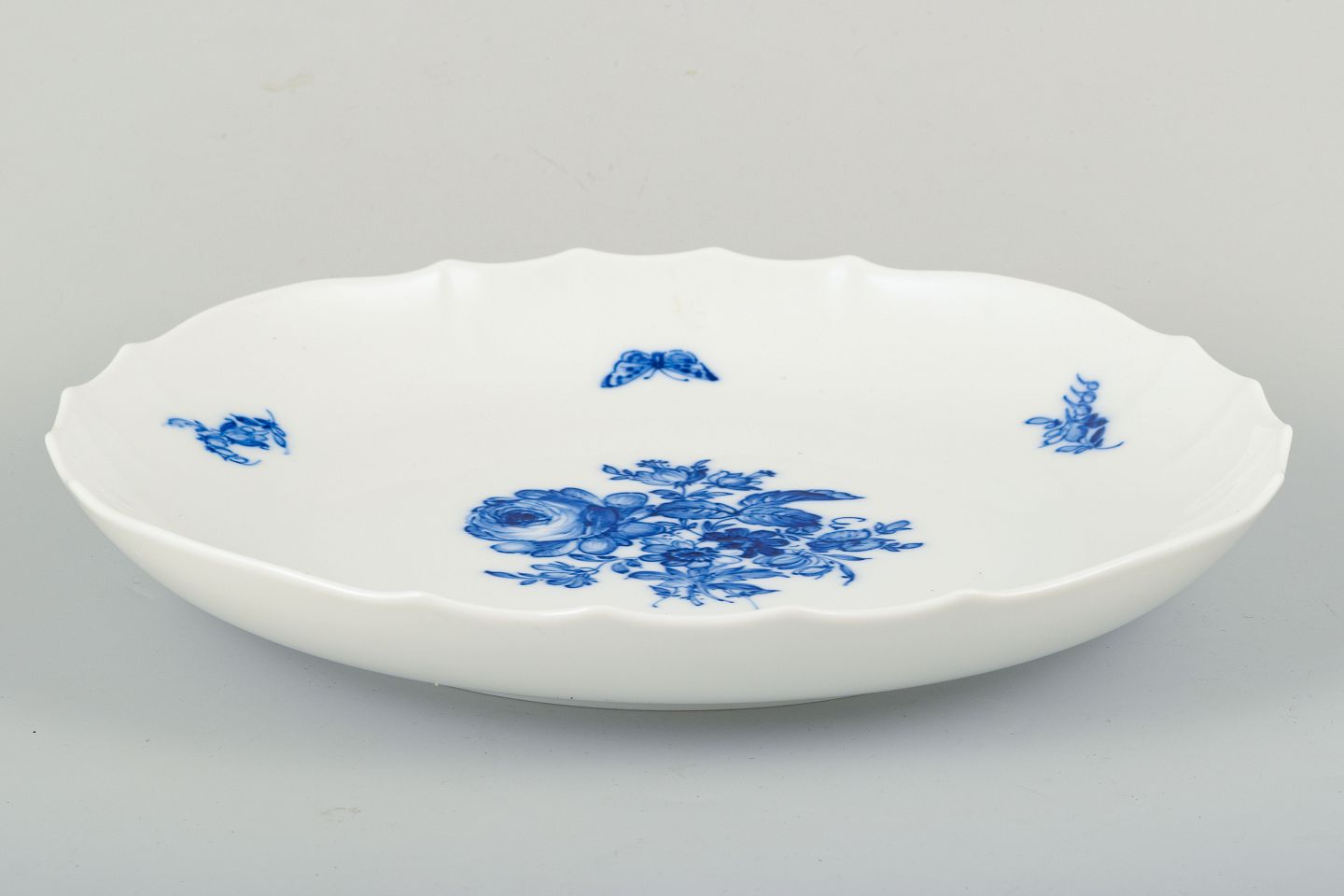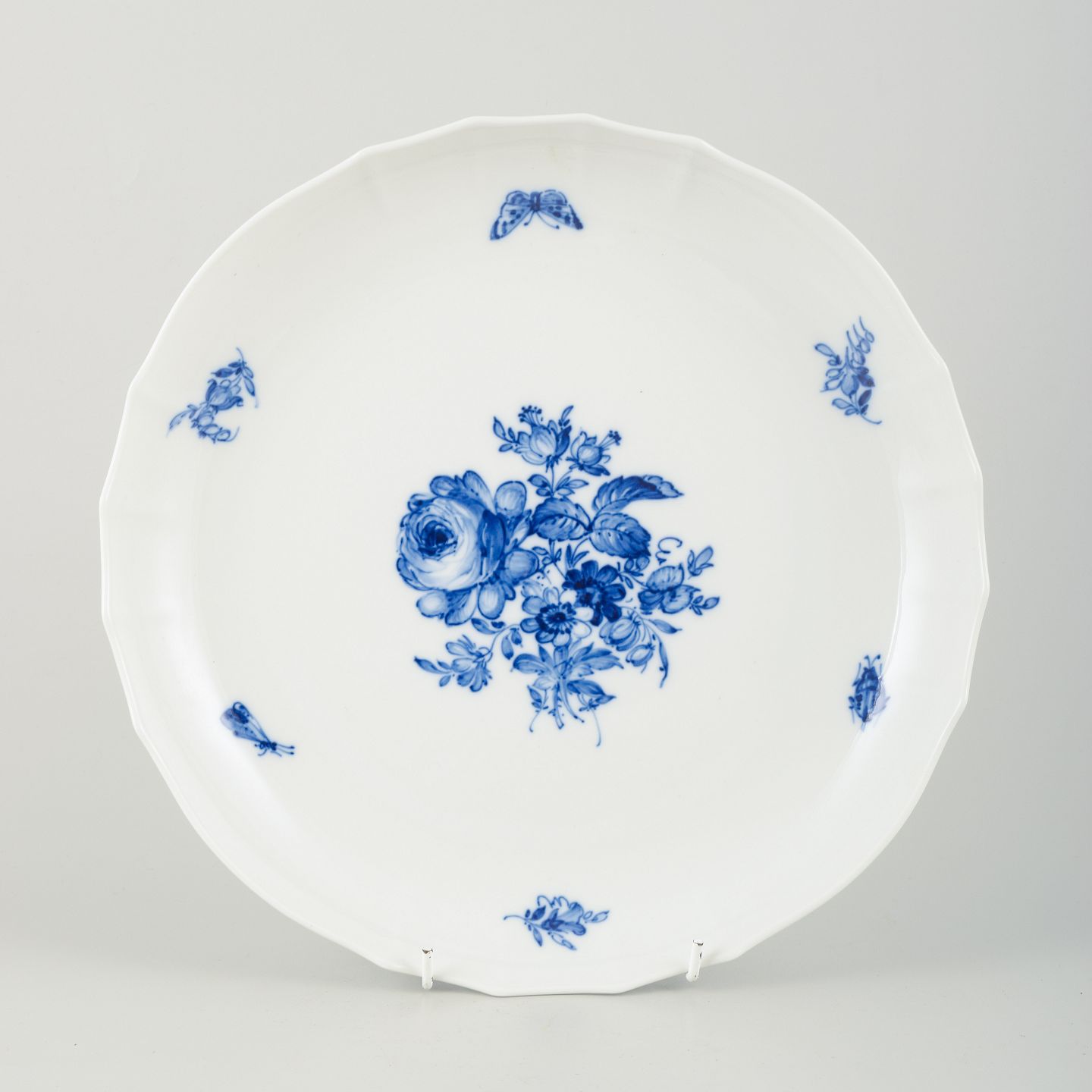 Tallerken fra Meissen i stellet “Blaue Blume”, dekoreret med blåt blomsterdekor og insekter i underglasur på hvidt porcelæn. Den klassiske blomsterdekoration er håndmalet med stor præcision og elegance, suppleret af små insektmotiver langs randen.