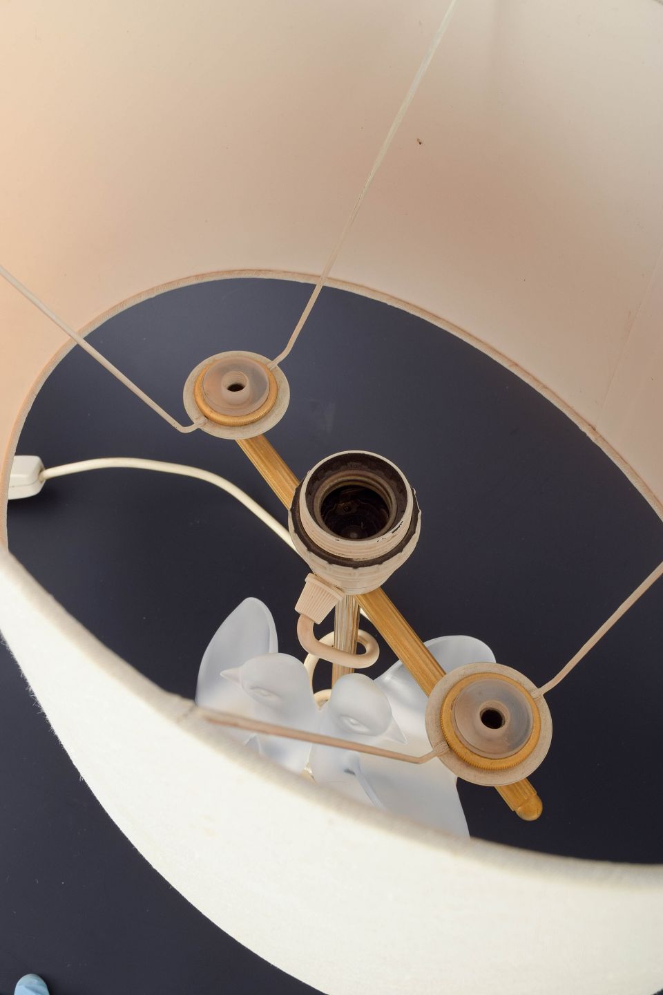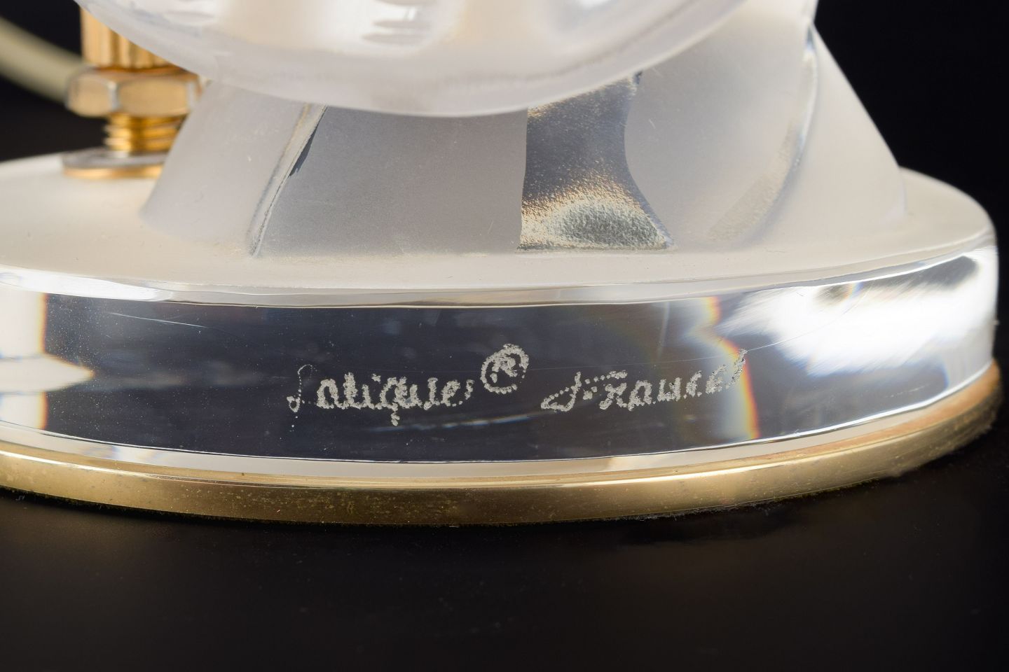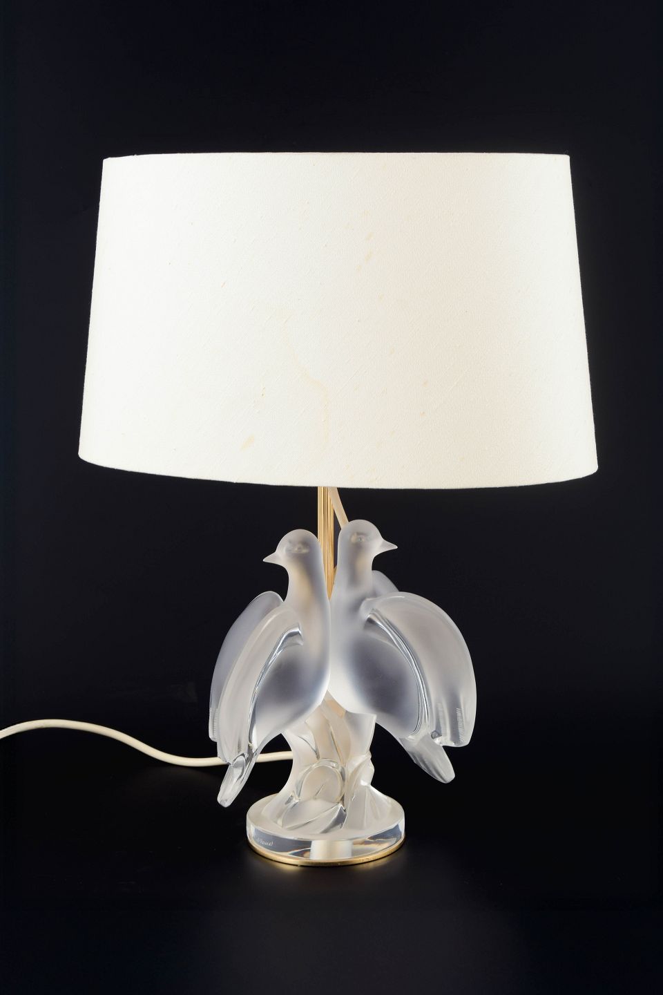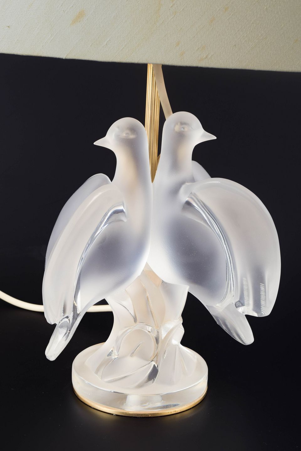 En bordlampe fra Lalique udført i presset og matteret krystalglas med motiv af to modsatrettede duer. Lampen står på en rund fod med messingdetaljer og er signeret Lalique® France under bunden.