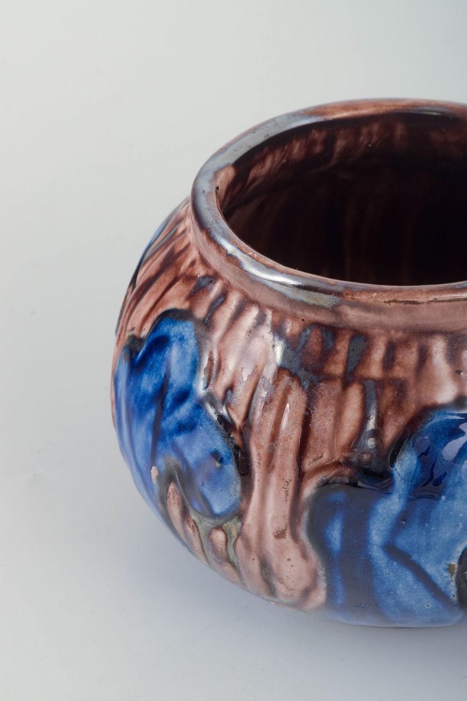 Dekorativ, lille vase, antageligt udført af Møller & Bøgely omkring 1918–1922. Vasen er dekoreret med reliefmønster og glasur i nuancer af brun og dyb blå med levende spil i overfladen. Klassisk rund form med markant reliefornamentik.