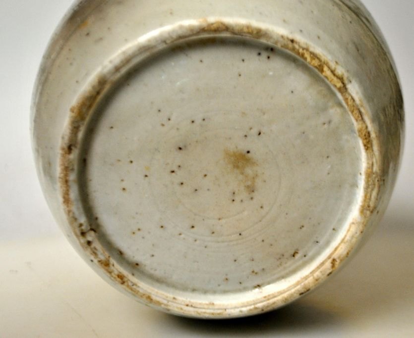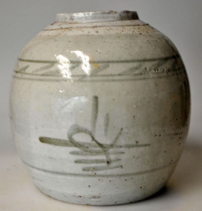 Kinesisk bojan uden låg, 19. årh. Grålig skærv med grålige landskabs dekorationer. H.: 15 cm. Dia.: 14,5 cm.
