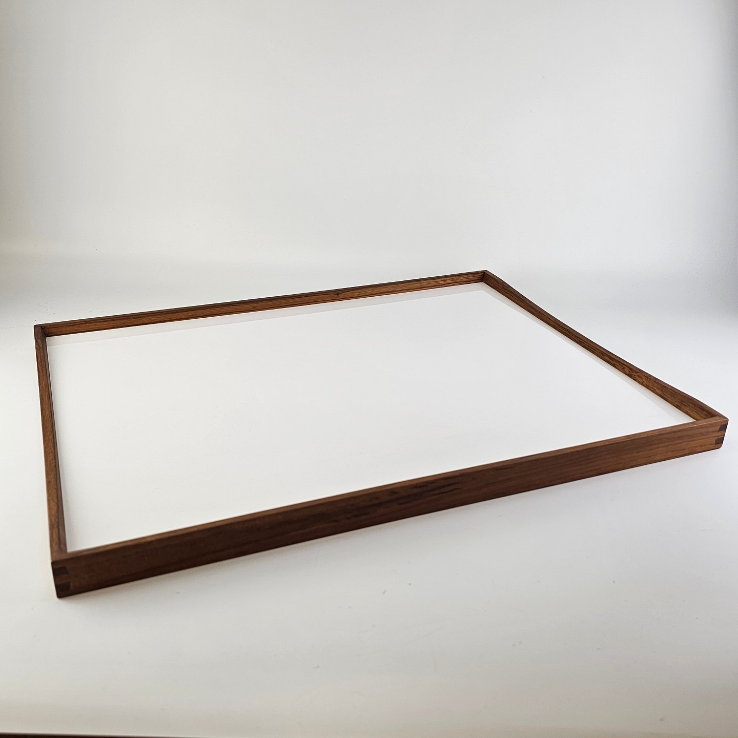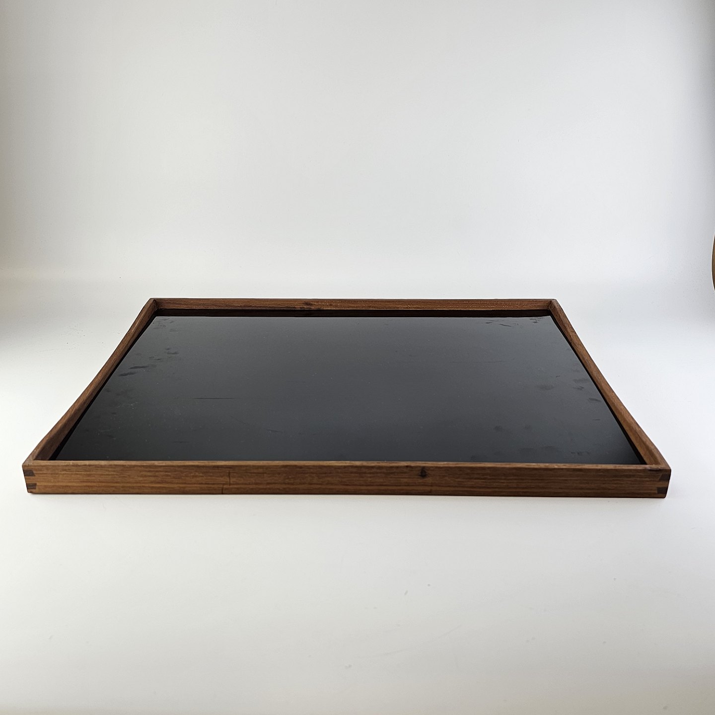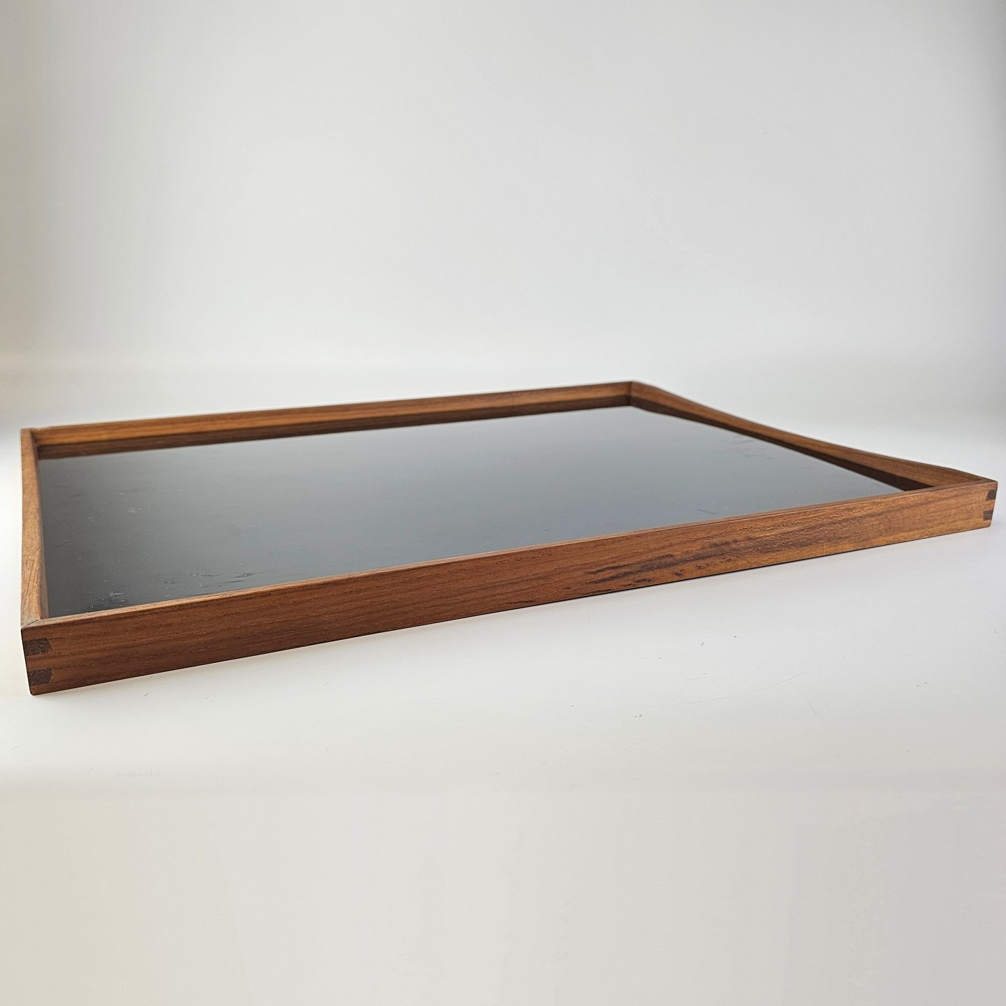 Vendbar bakke i teak tre og højglans laminat, sort på den ene side og hvid på den anden