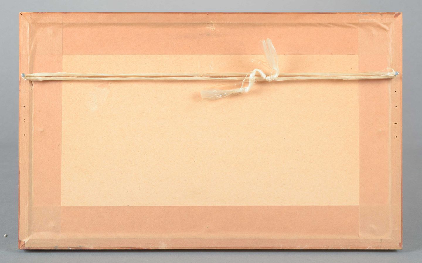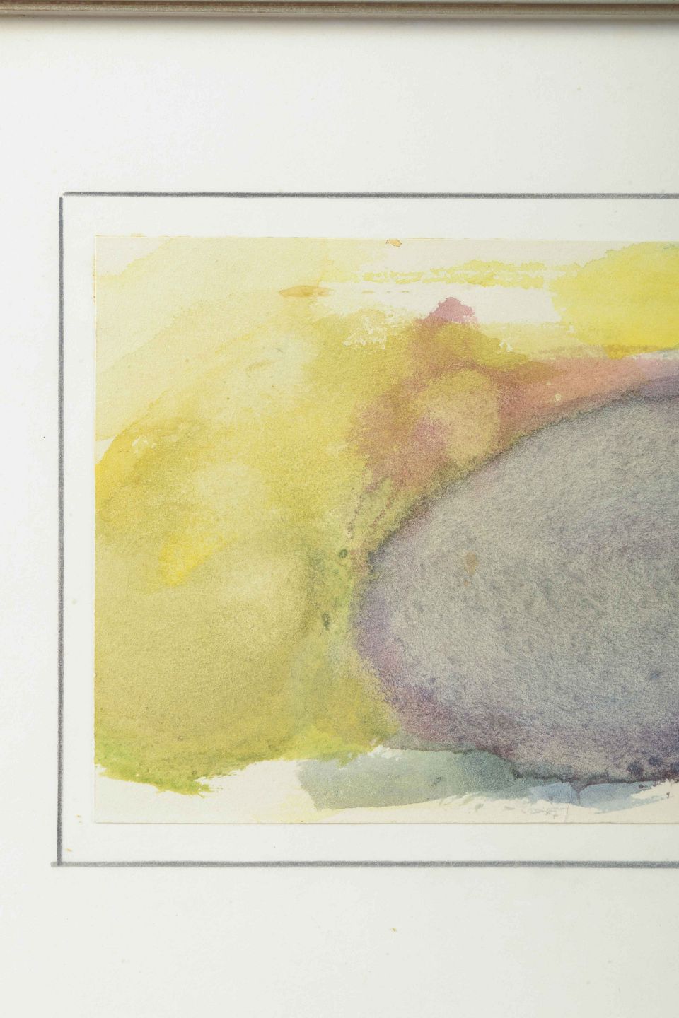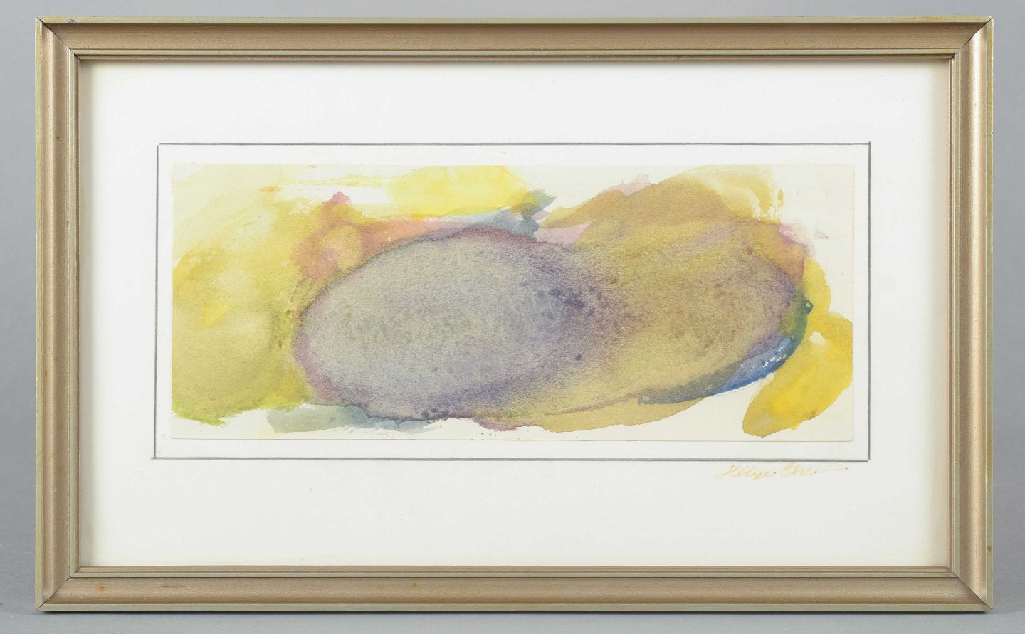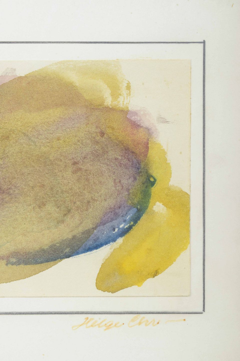 En eksperimenterende akvarel af Helge Christiansen, hvor bløde penselstrøg i gule, grønne og violette toner danner en organisk, næsten svævende oval form i centrum. Værket balancerer mellem det rent abstrakte og en naturinspireret farvesymfoni og illustrerer Christiansens interesse for farveflader og formens opløsning i 1960’ernes danske modernisme.