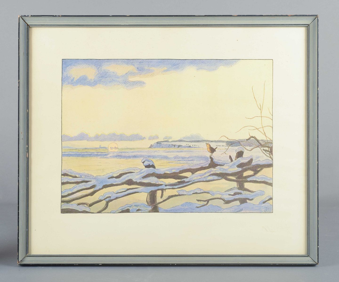 Et stemningsfuldt vintermotiv af Johannes Larsen, der skildrer den kølige decembermorgen med sneklædte grene, havets horisont og en ensom fugl i forgrunden. Værket fremviser kunstnerens karakteristiske sans for naturens stemninger og det enkle, men præcise linjesprog.