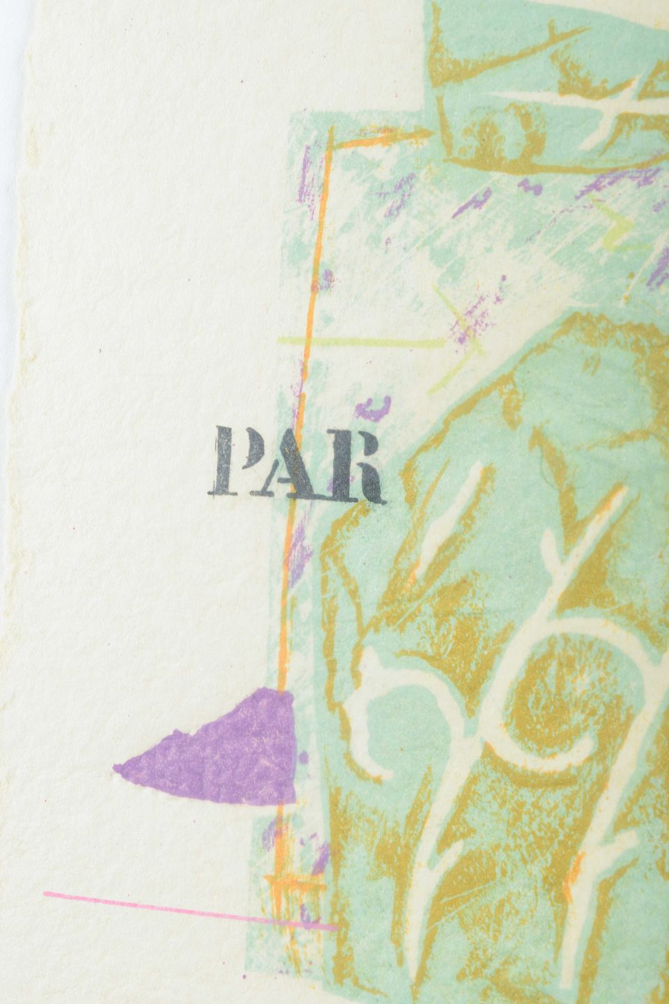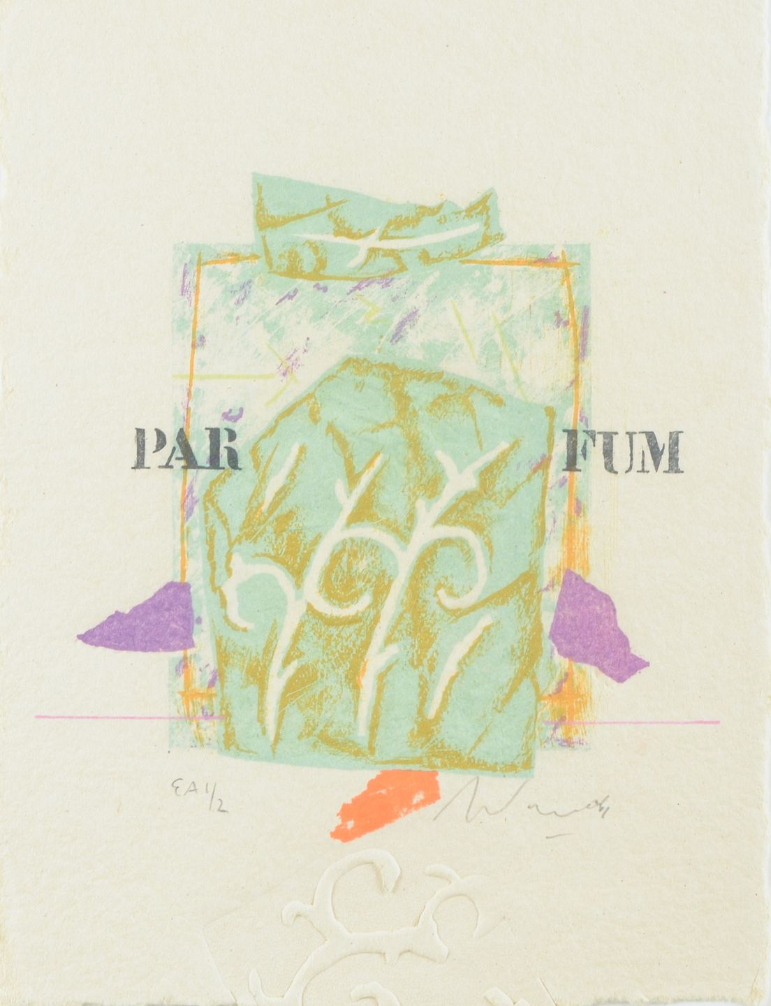 Et karakteristisk litografi af Alain Soucasse, hvor farver, mønstre og tekstfragmenter kombineres i en poetisk og grafisk komposition. Trykket bærer betegnelsen Épreuve d’Artiste (EA), hvilket betyder, at det er et kunstnertryk uden for den officielle oplagsnummerering, i dette tilfælde et særdeles sjældent eksemplar (1 af kun 2 EA).