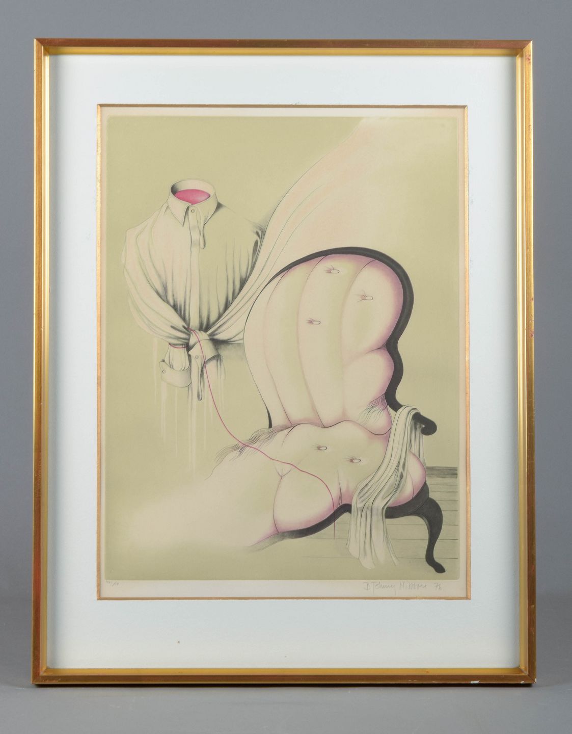 Et særpræget surrealistisk blad af Nilsson, hvor hverdagsobjekter forskydes til drømmeagtige og symboltunge figurer. Et værk med stærk visuel appel for samlere af svensk surrealistisk grafik.