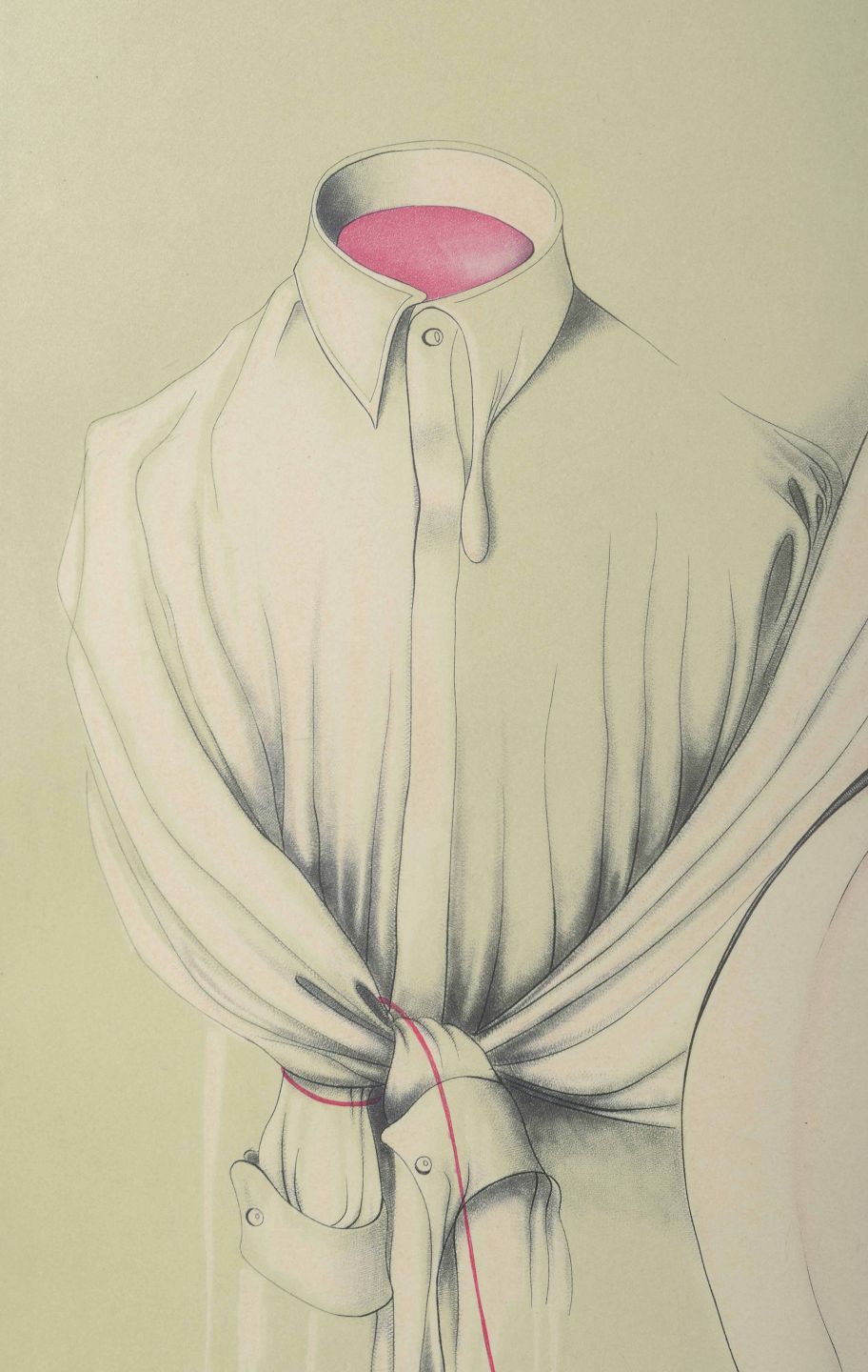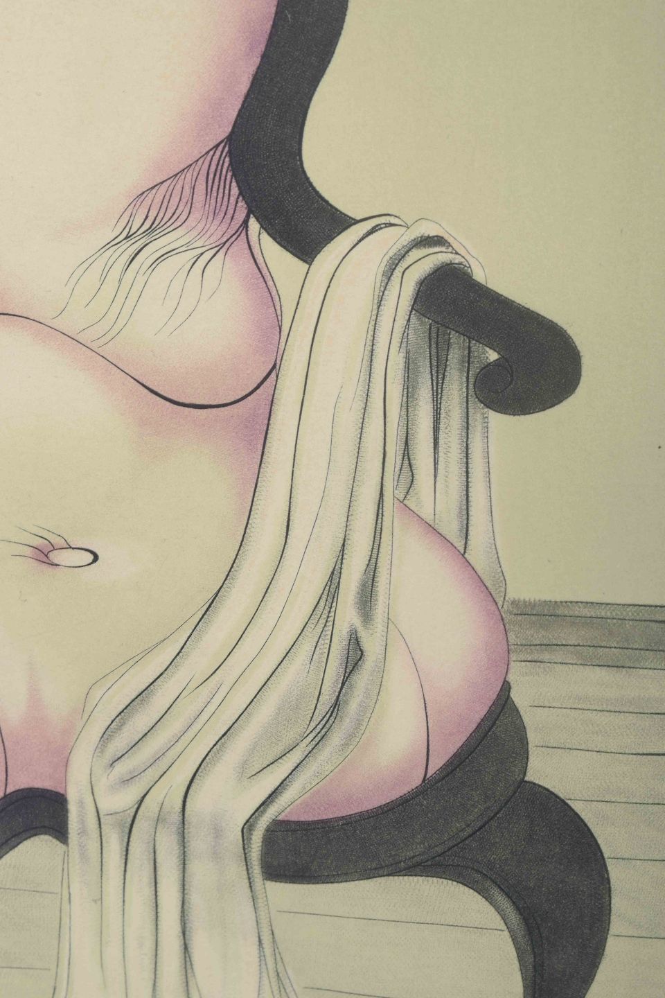 Surrealistisk farveætsning med motiv af en klassisk polstret lænestol, hvor stoffet transformeres til klæde og tråd, forbundet med en ophængt skjorte uden hoved. Værket leger med illusion, metamorfose og symbolik, og fremstår med et poetisk men samtidig foruroligende billedsprog.