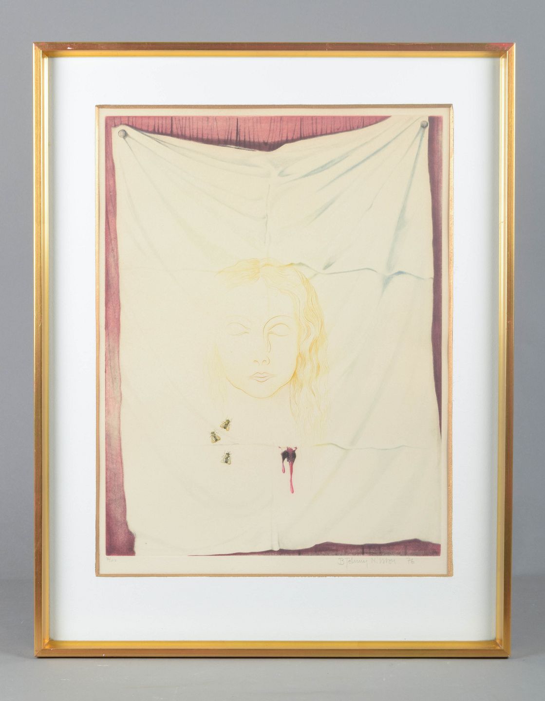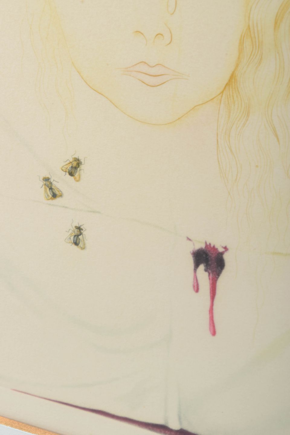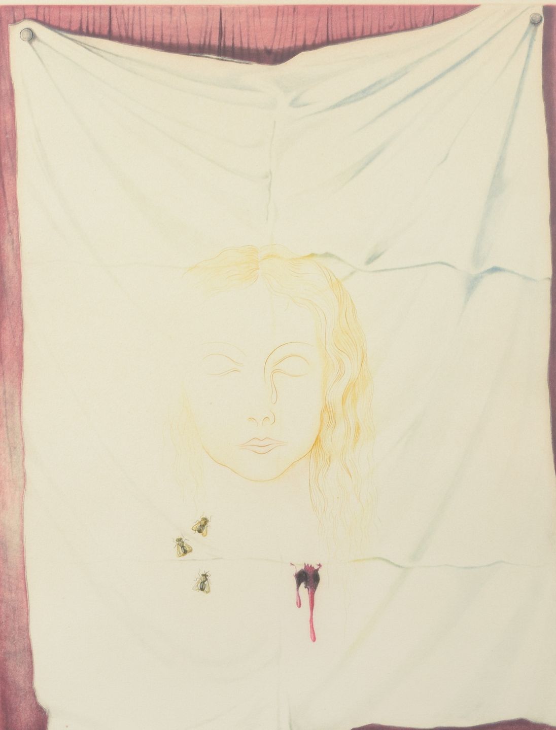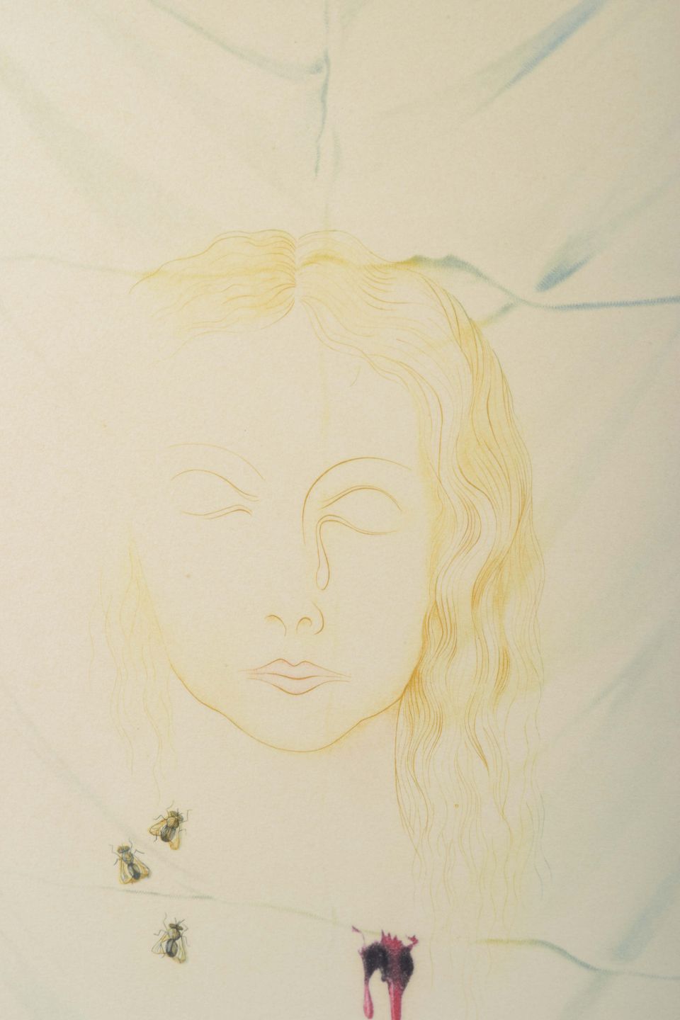 Surrealistisk farveætsning af en kvindes ansigt, antydet med fine linjer og gyldne toner, fremstillet mod en foldet klædeflade. Kompositionen rummer tre hvepse samt en bloddråbe, der giver værket en symbolsk og urovækkende karakter.