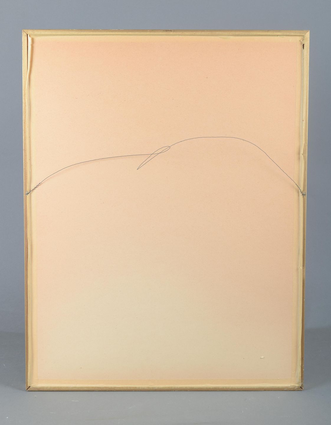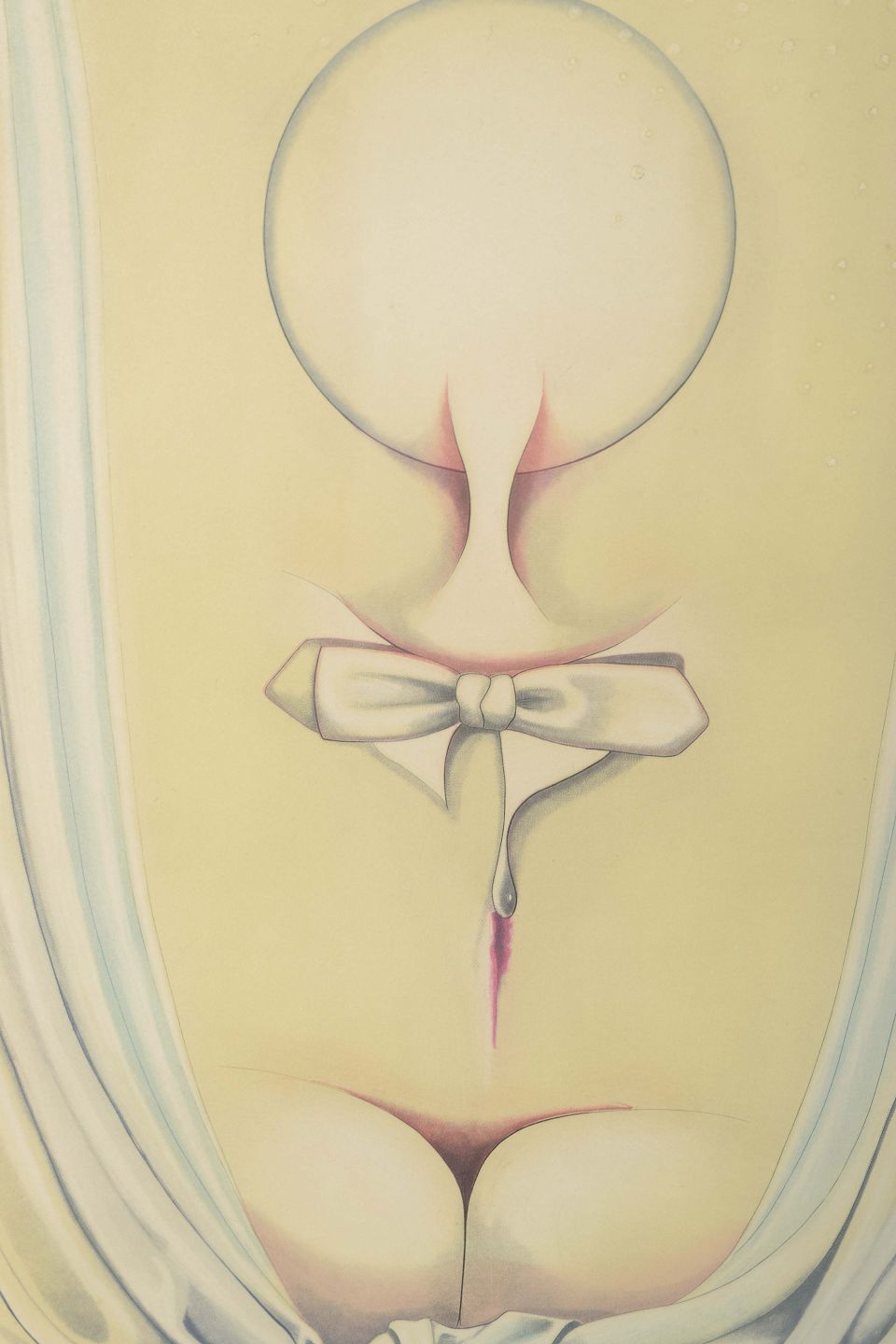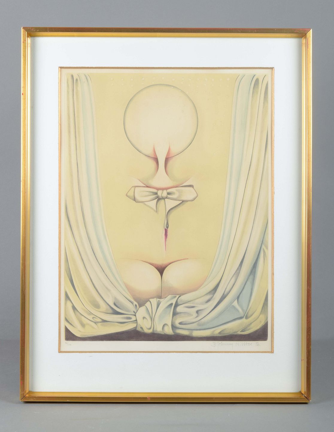 Farveætsning med surrealistisk motiv. Kompositionen viser en stiliseret kvindefigur, delvist skjult bag tunge gardiner, med et bånd og cirkulært hovedmotiv. Værket fremstår i bløde, afdæmpede farvetoner med stærk symbolik og drømmeagtig karakter.