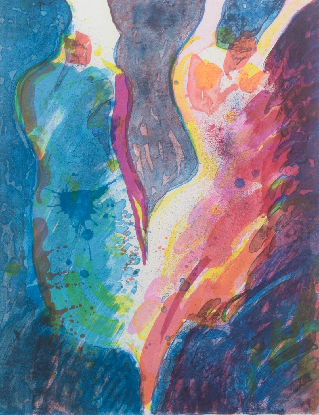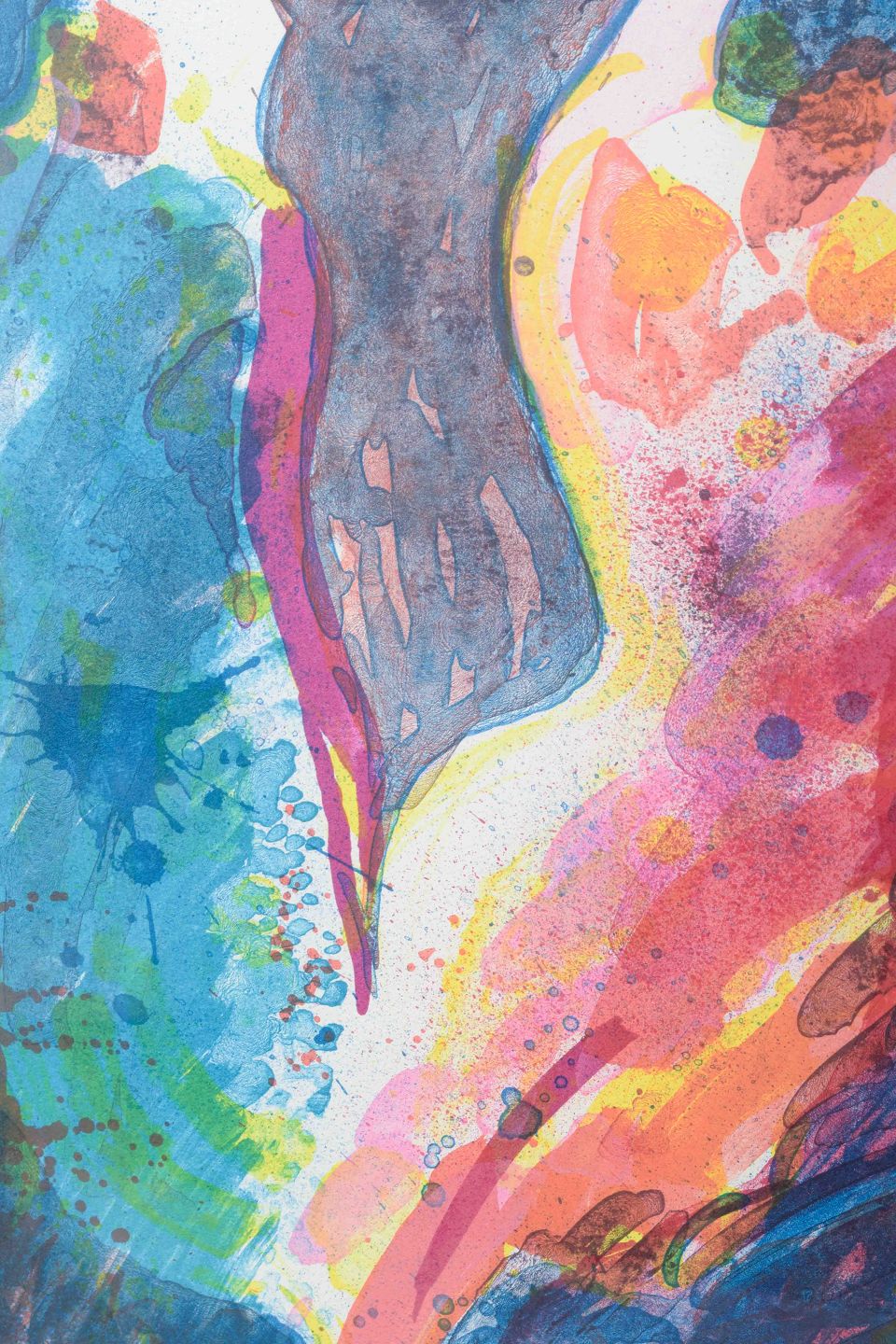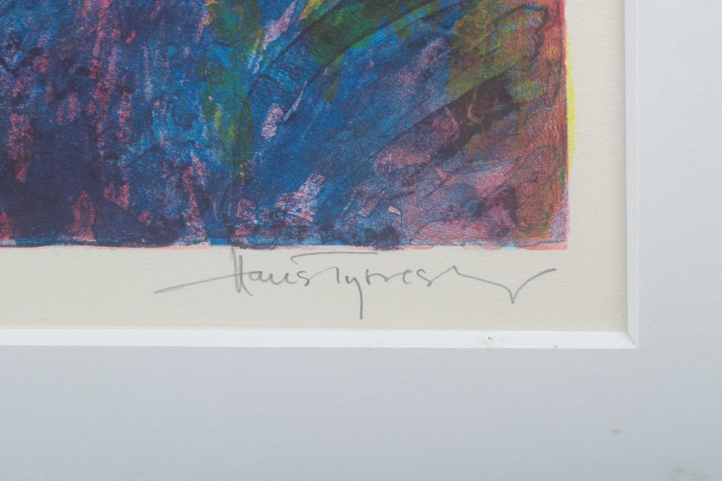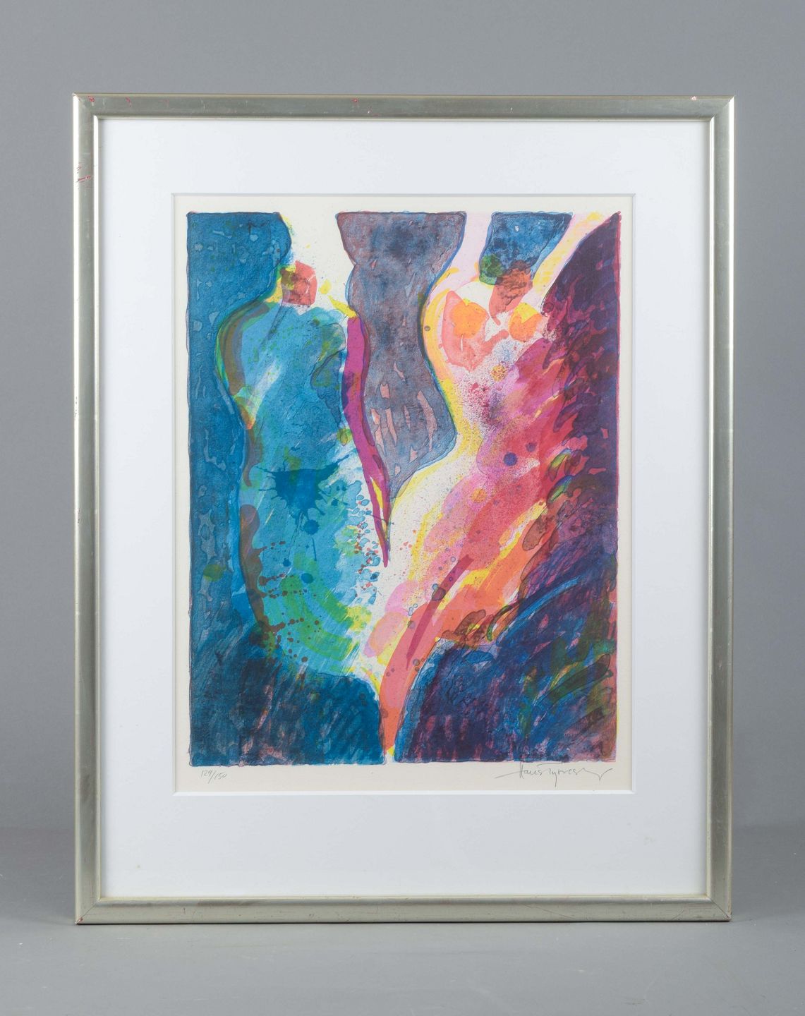 Farverigt litografi af Hans Tyrrestrup (f. 1944), udført i ekspressiv stil med organiske, overlappende former i blå, grønne, røde og gule nuancer. Værket er nummereret 119/150 og signeret med blyant. Udført ca. 1980’erne–1990’erne.
