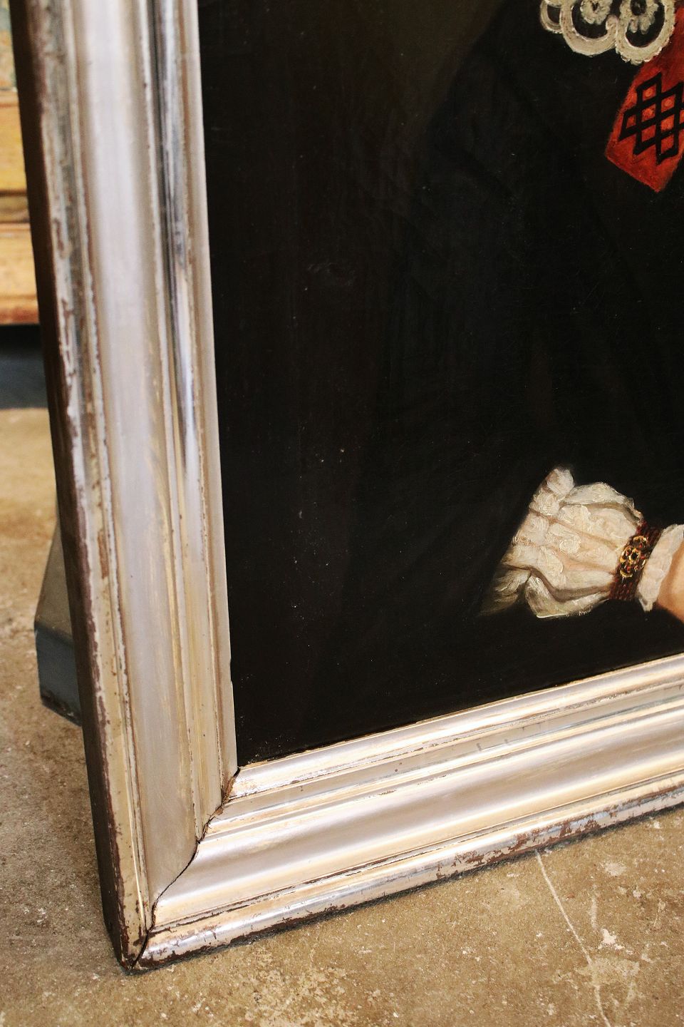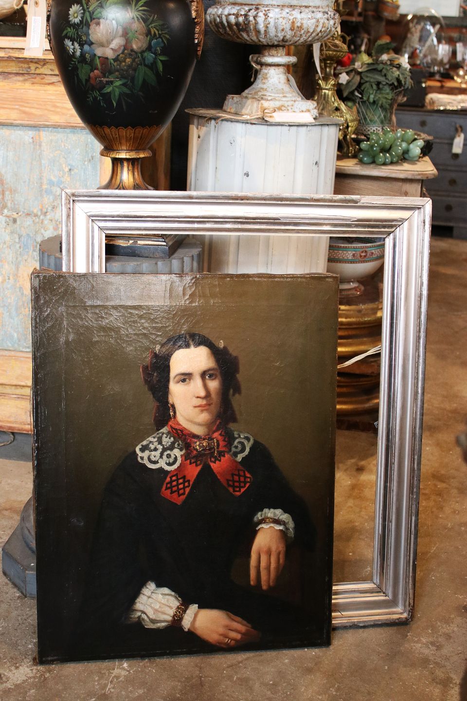 Gammelt oliemaleri fra midten af 1800 tallet , portræt af kvinde i sølv ramme...