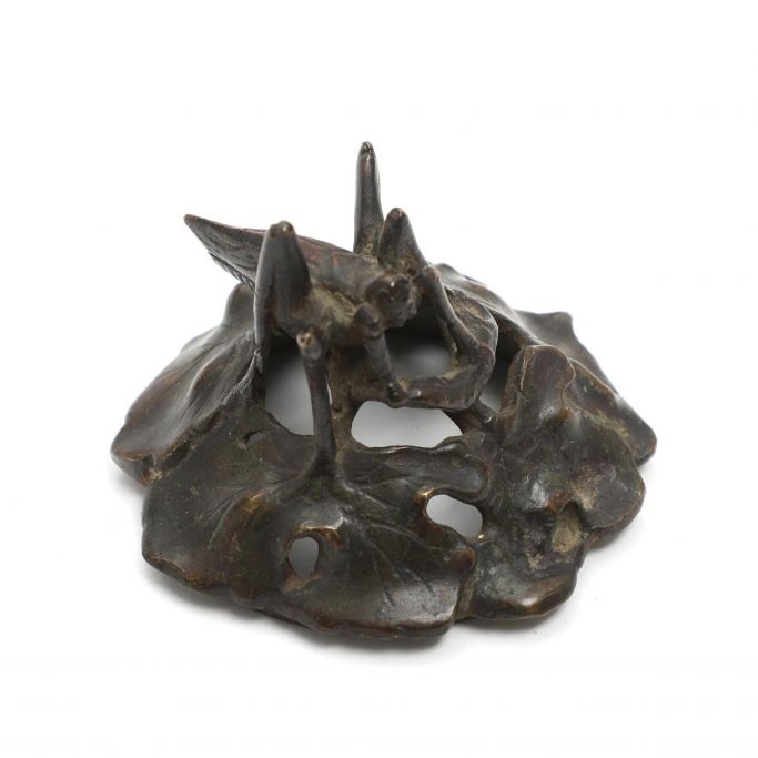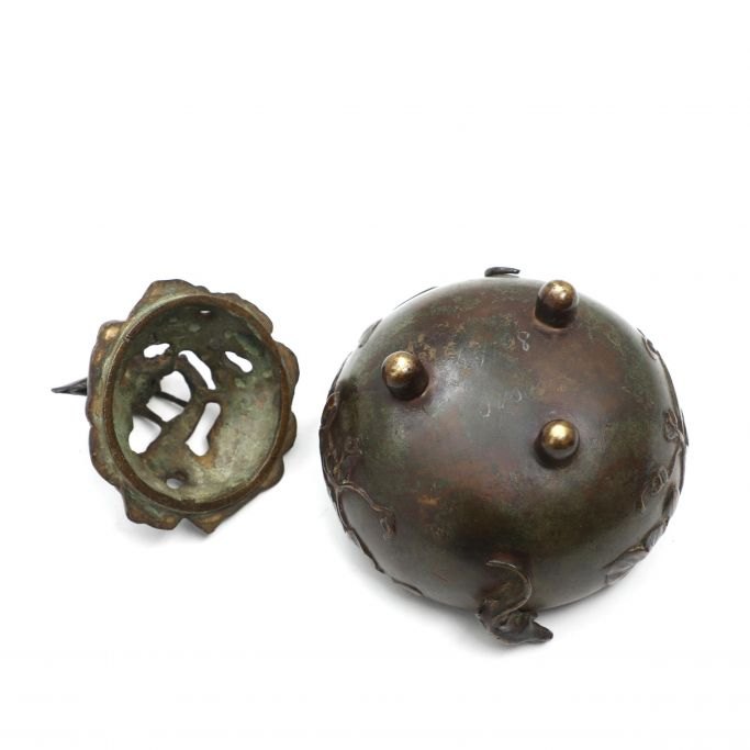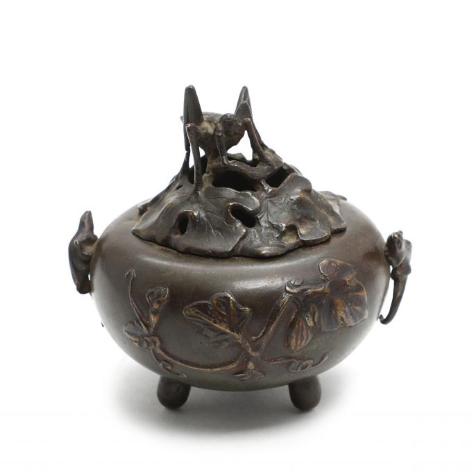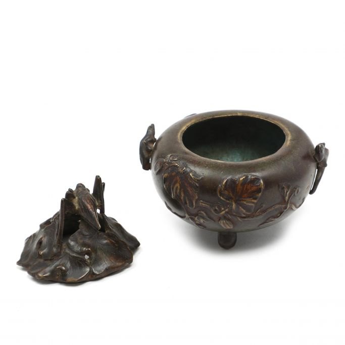 Japansk røgelseskar af patineret bronze, delvist gennembrudt låg med en græshoppe, sider støbte i let relief med kalabasser, hanke i form af firben, stående på tre små fødder. Ca. 1900. H. inkl. låg 11. Diam. ved munding 6.