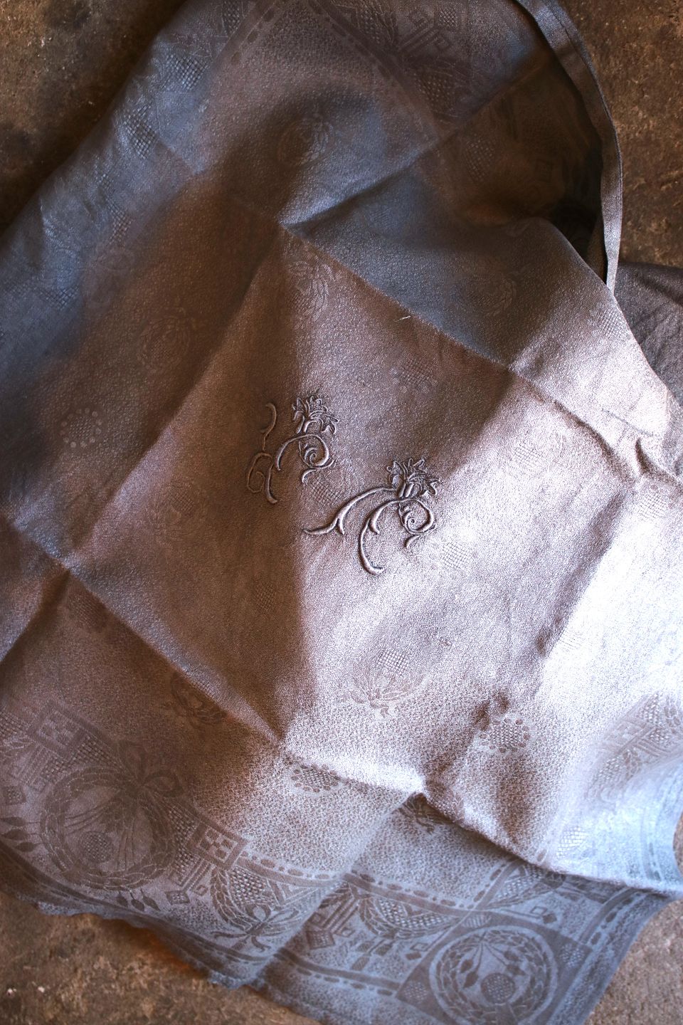med fint mønster og flot monogram i flot grå farve.