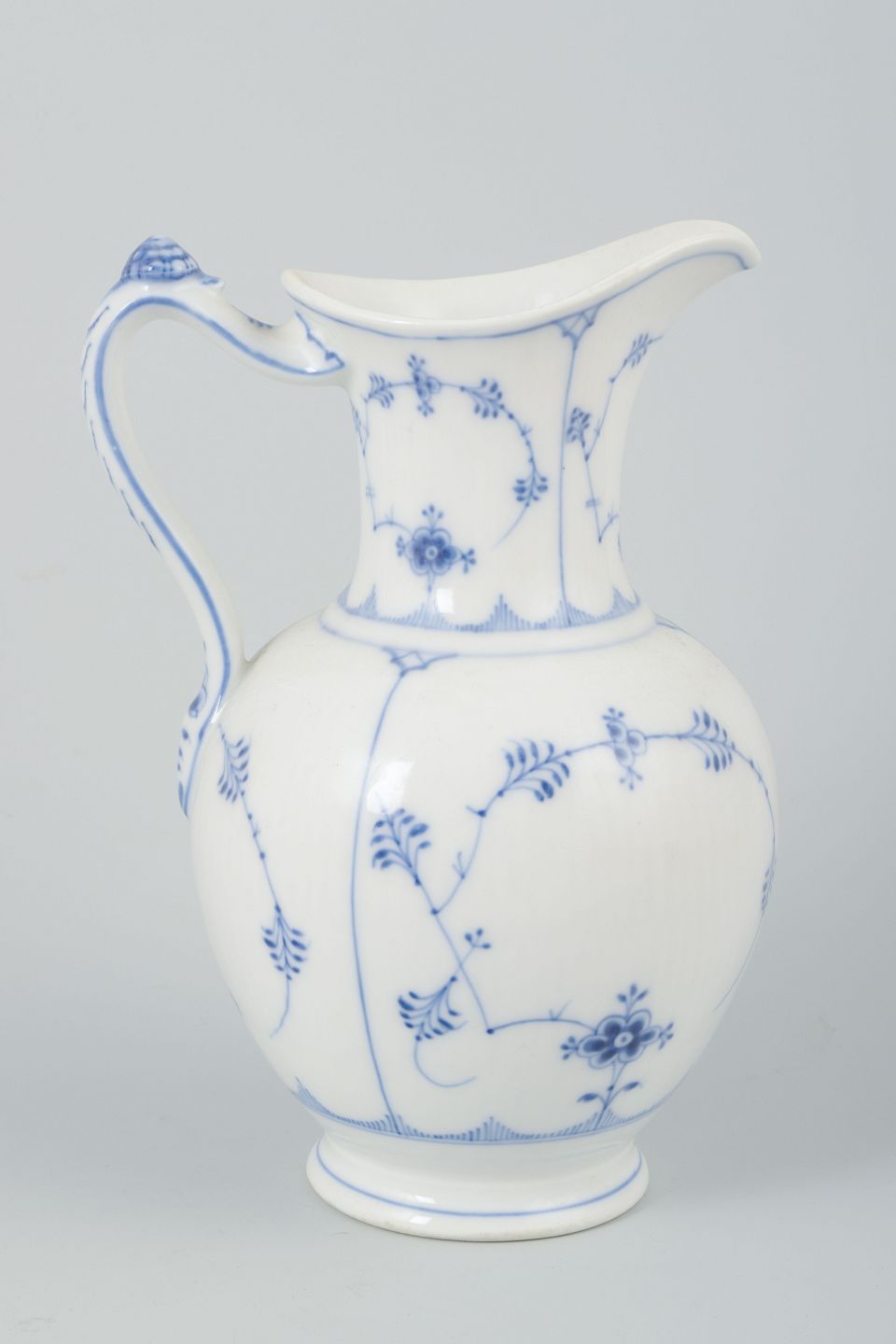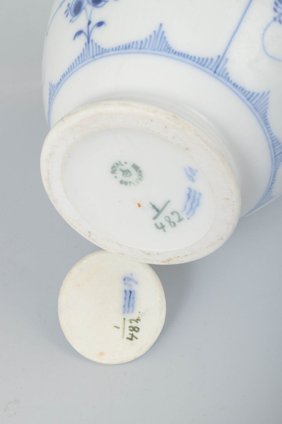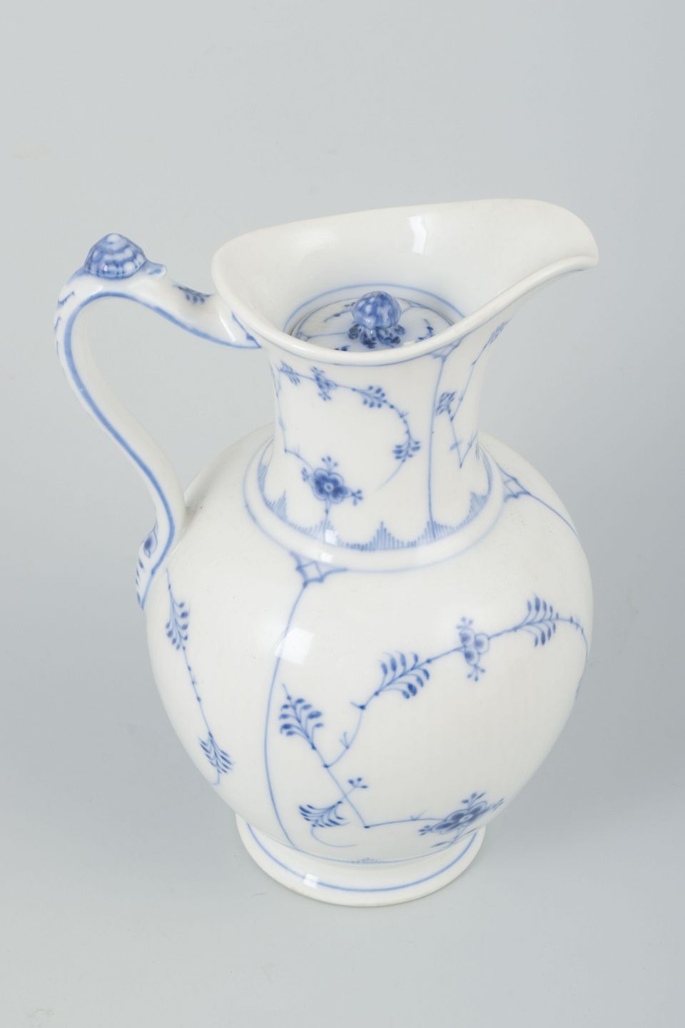 Signatur / mærke: Royal Copenhagen bølgemærke (1. sortering), fabriksstempel, formnr. 1/482, malernr. 60 (kande) og 17 (låg)