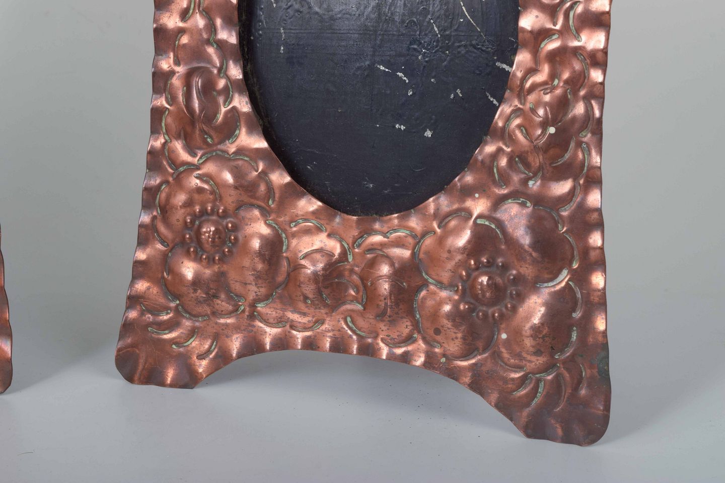 To dekorative billedrammer i præget kobber med blomstermotiver og oval åbning. Bagside med støttefod til placering på bord.