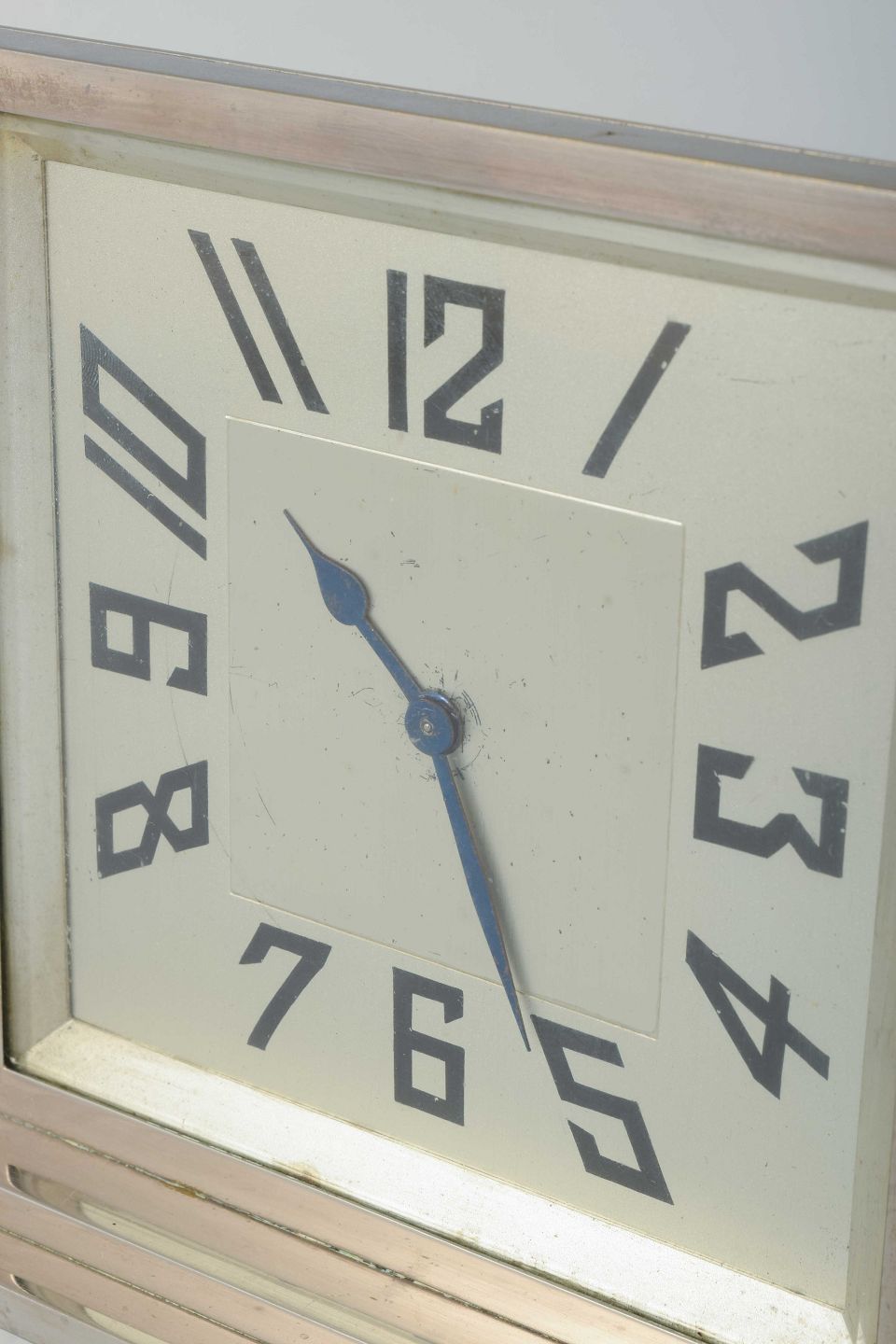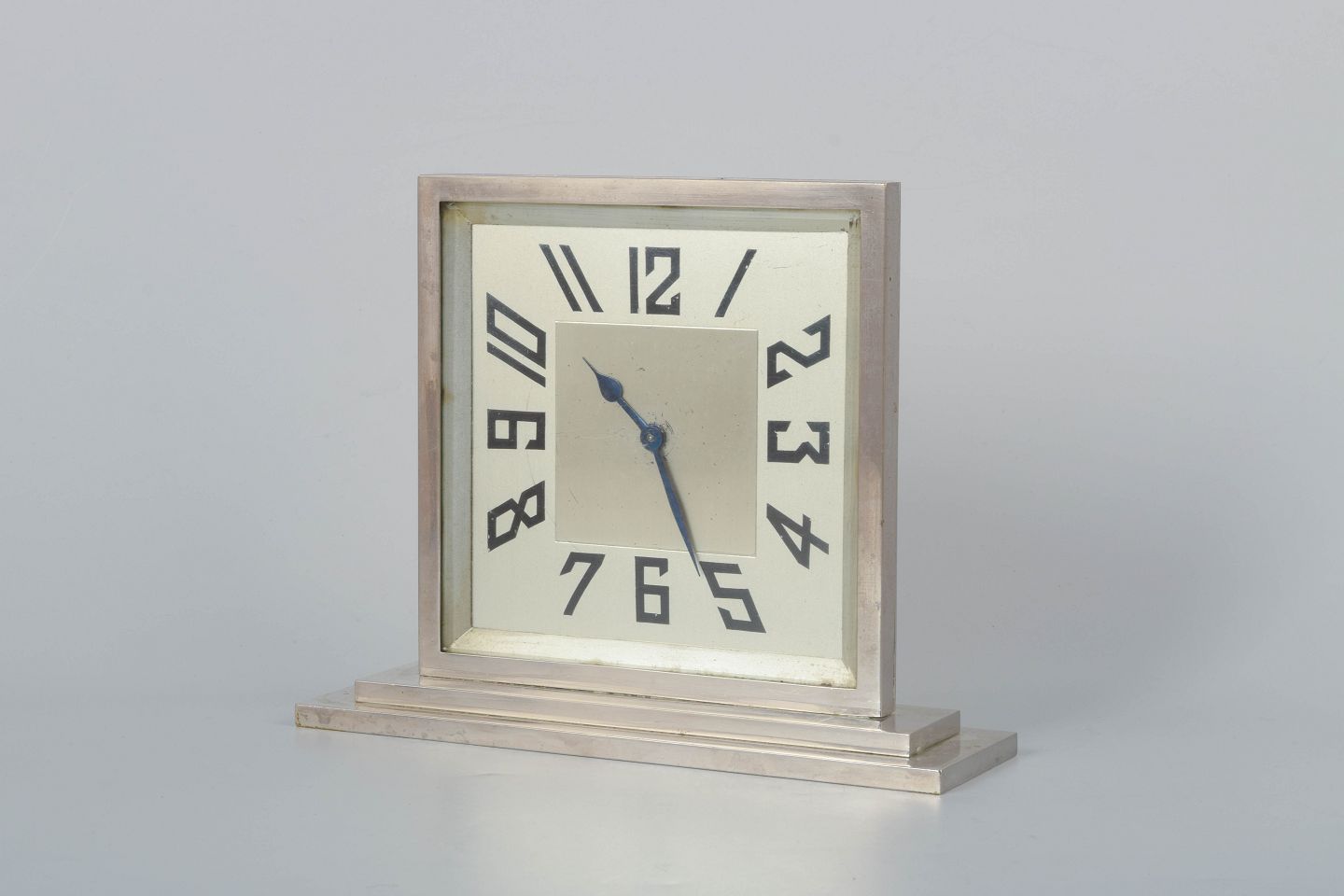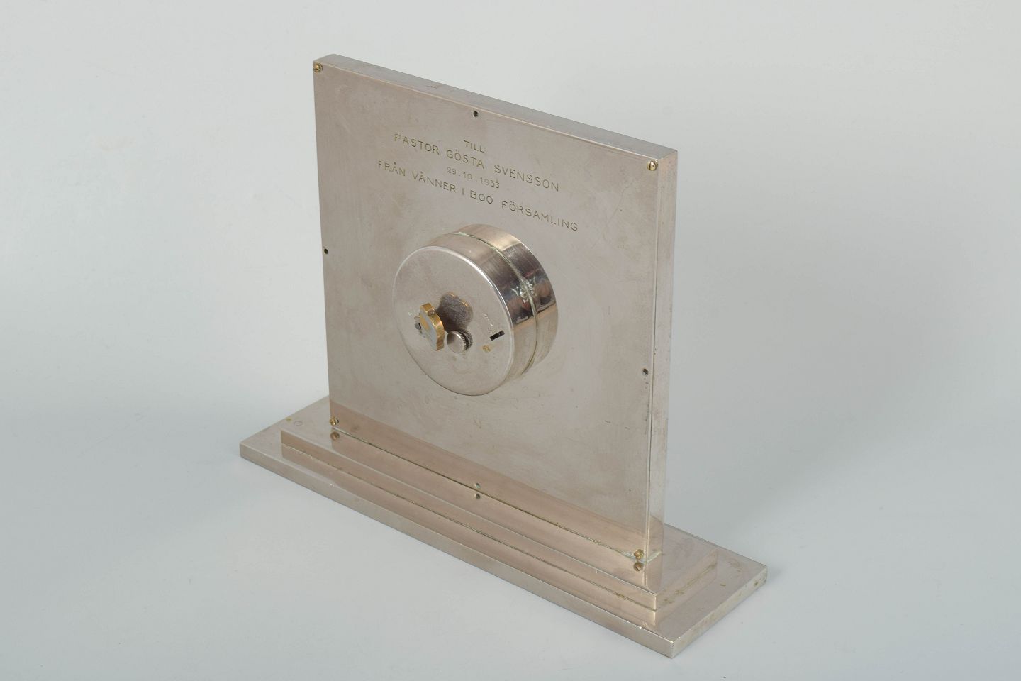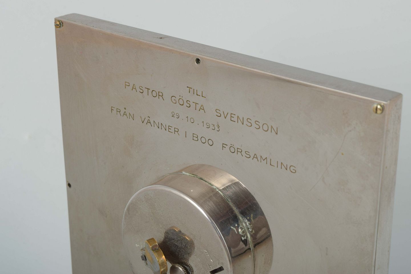Elegant kvadratisk manuelt ur på rektangulær fod med geometrisk Art Deco-design. Skive med sortmalede, stiliserede tal og blånerede visere. Bagsiden med indgraveret indskrift: ”Till Pastor Gösta Svensson 29.10.1933 från vänner i Boo församling.”