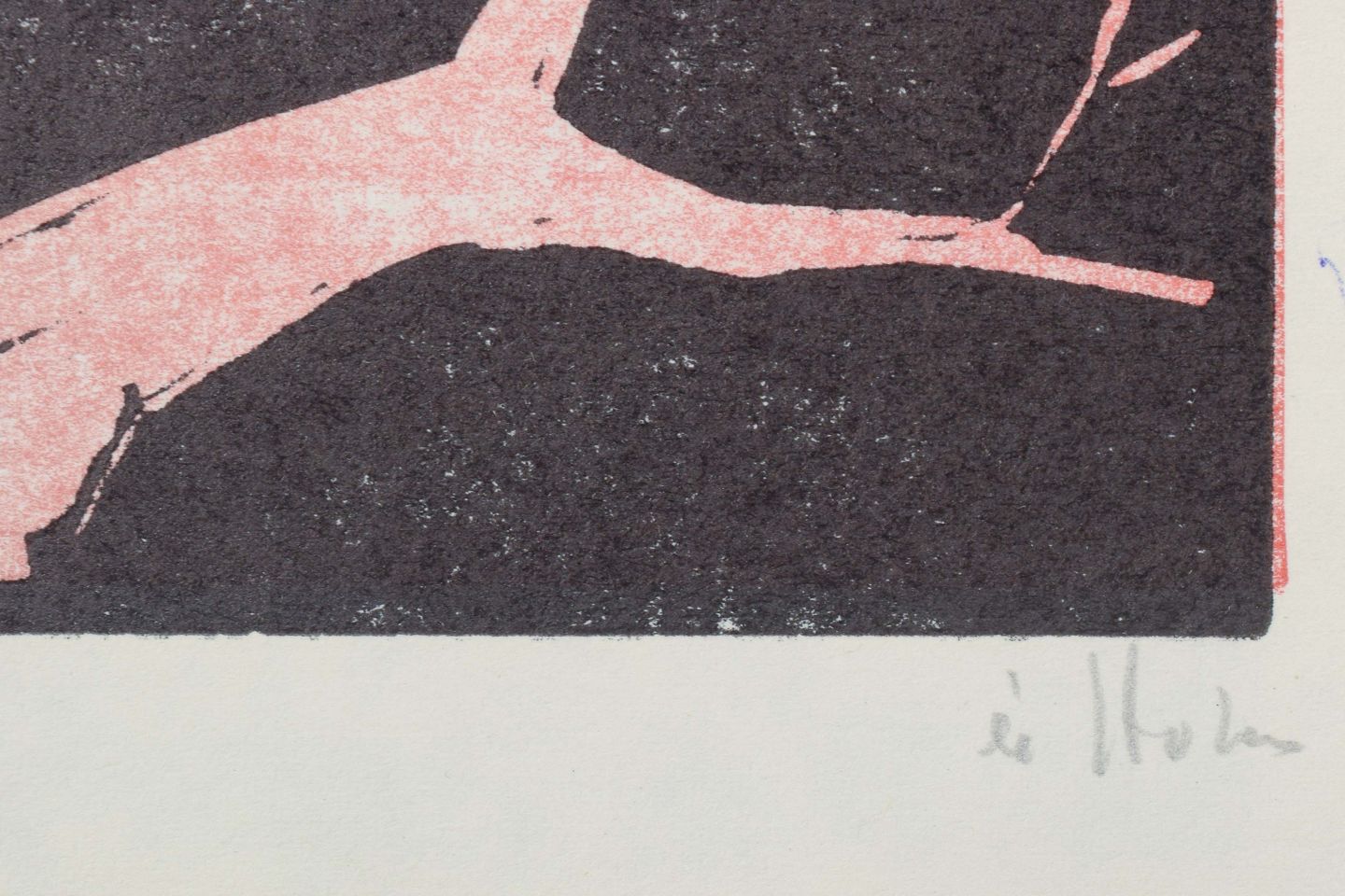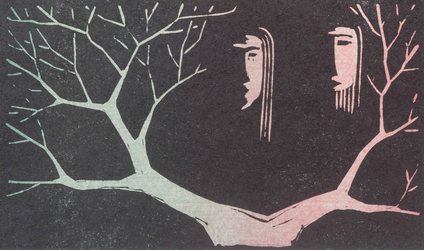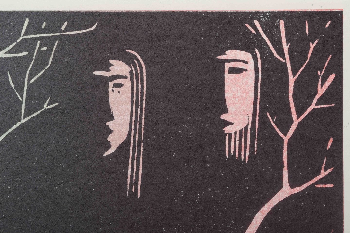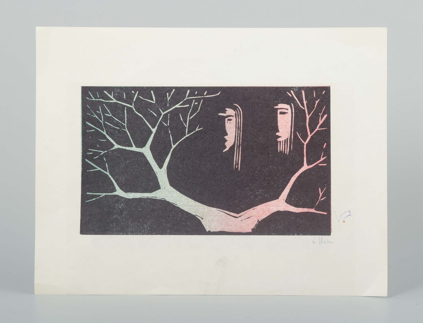 Farvet træsnit med motiv af to stiliserede ansigter, indrammet af grene der strækker sig hen over billedfladen. Trykt i dæmpede toner af grøn og rosa mod mørk baggrund, hvilket skaber et poetisk og symbolsk udtryk. Signeret nederst til højre “Åke Holm”.