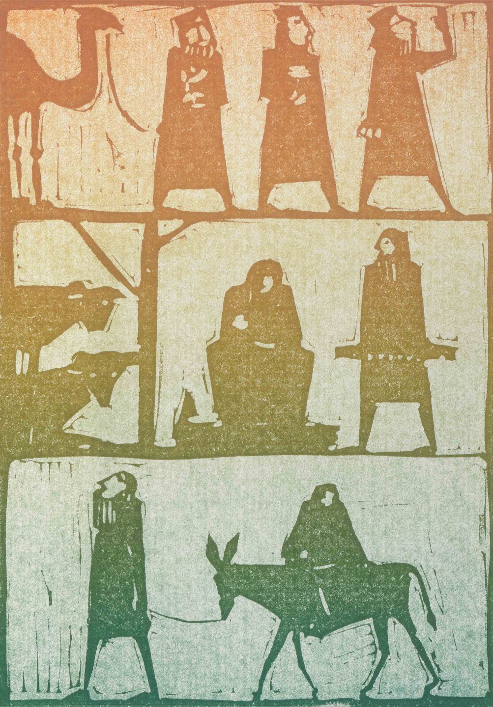 Farvet træsnit opdelt i tre billedfelter. Øverst de hellige tre konger med kamel, i midten Jomfru Maria og Josef, nederst flugten til Egypten med Maria ridende på et æsel. Trykt i grønne og orange nuancer, der skaber en ikonisk og dekorativ fremstilling.