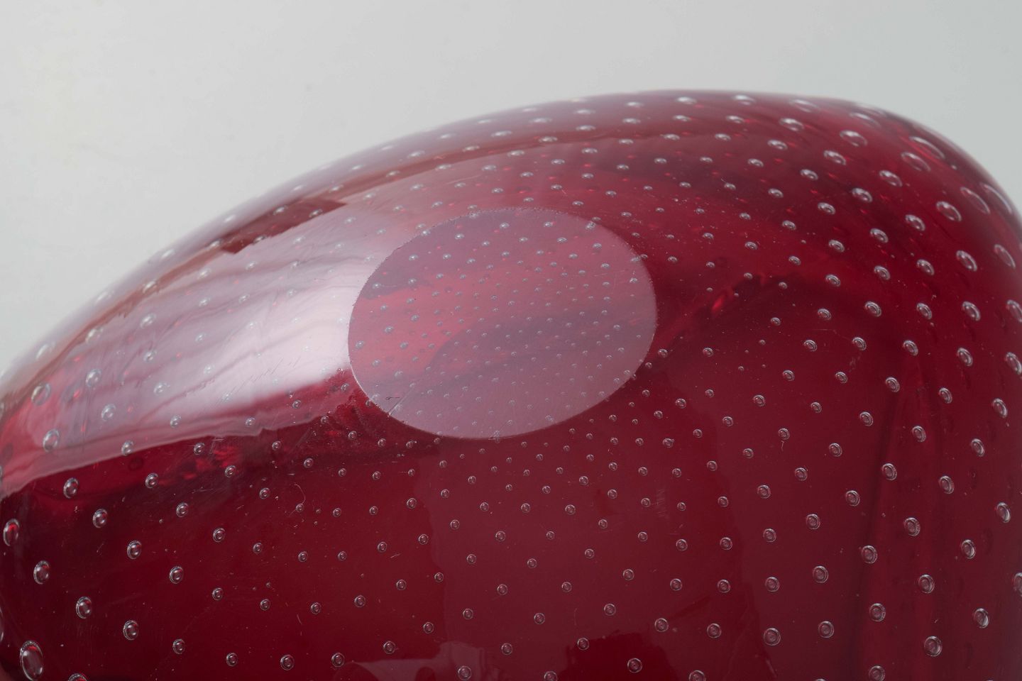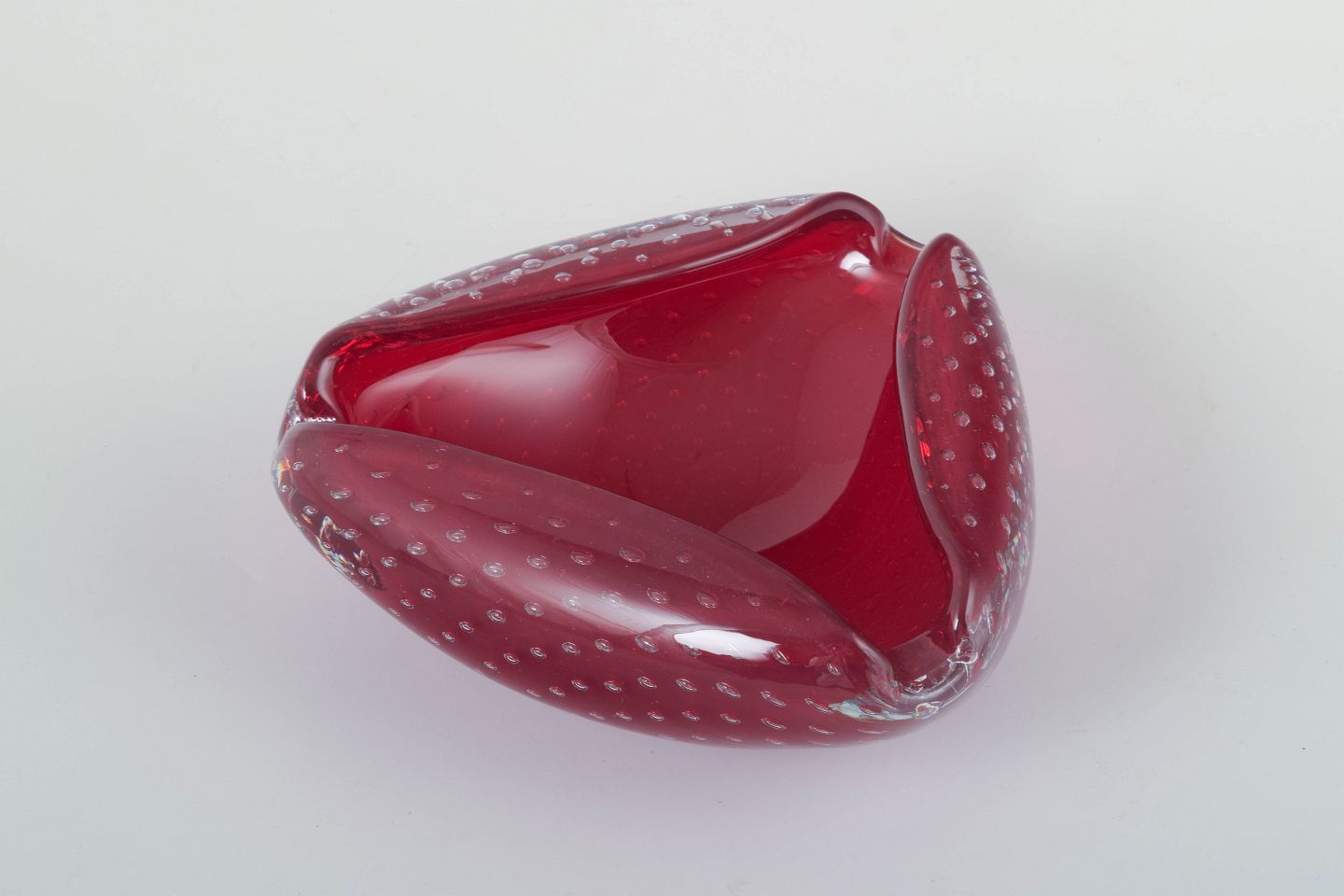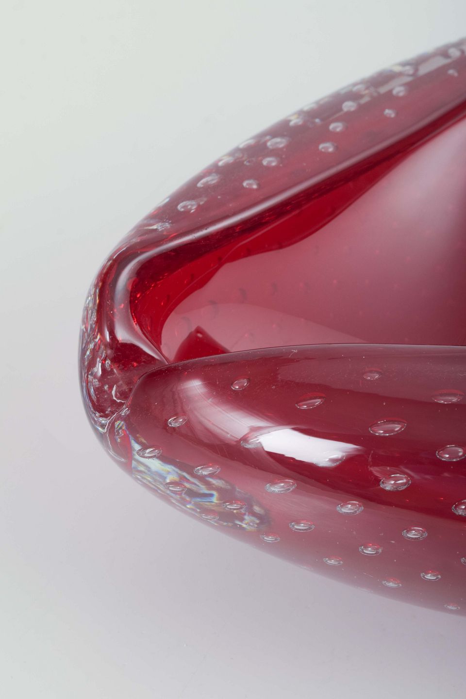 Organisk formet skål i rubinrødt glas med indfangede luftbobler i dekoration (bullicante-teknik). Blødt foldede sider giver et skulpturelt og levende udtryk. Et klassisk eksempel på Muranos glasdesign fra 1960’erne.
