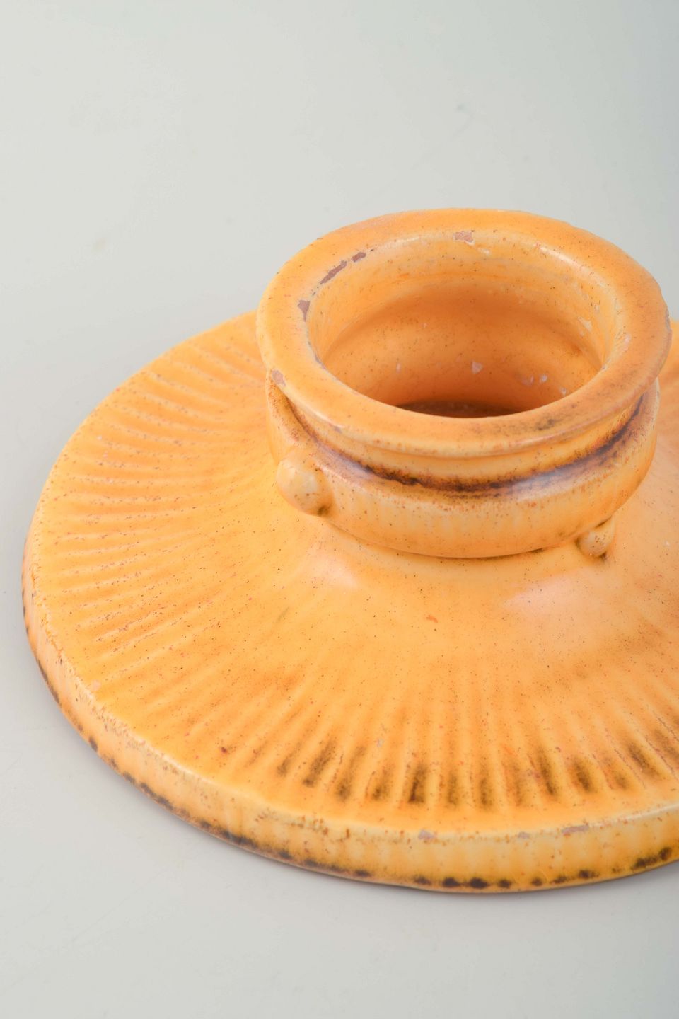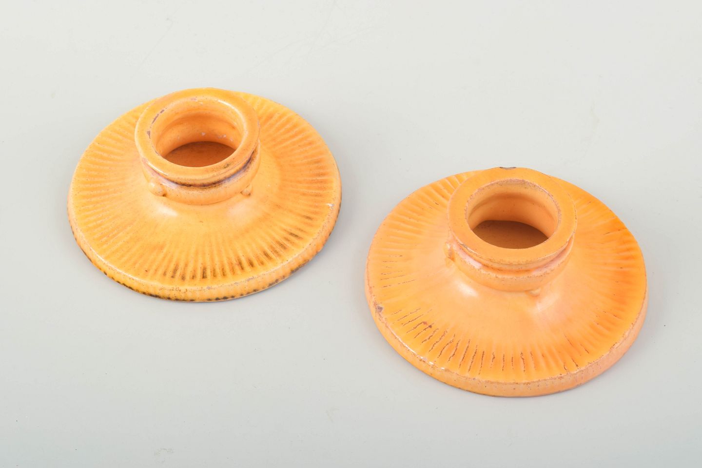 To lave, runde lysestager i keramik med bred fod og lav lyseholder. Glasur i stærk orange uran-glasur med fint indridset dekor, der danner et solstråleagtigt mønster. Begge stager signeret under bunden med HAK (Herman A. Kähler)