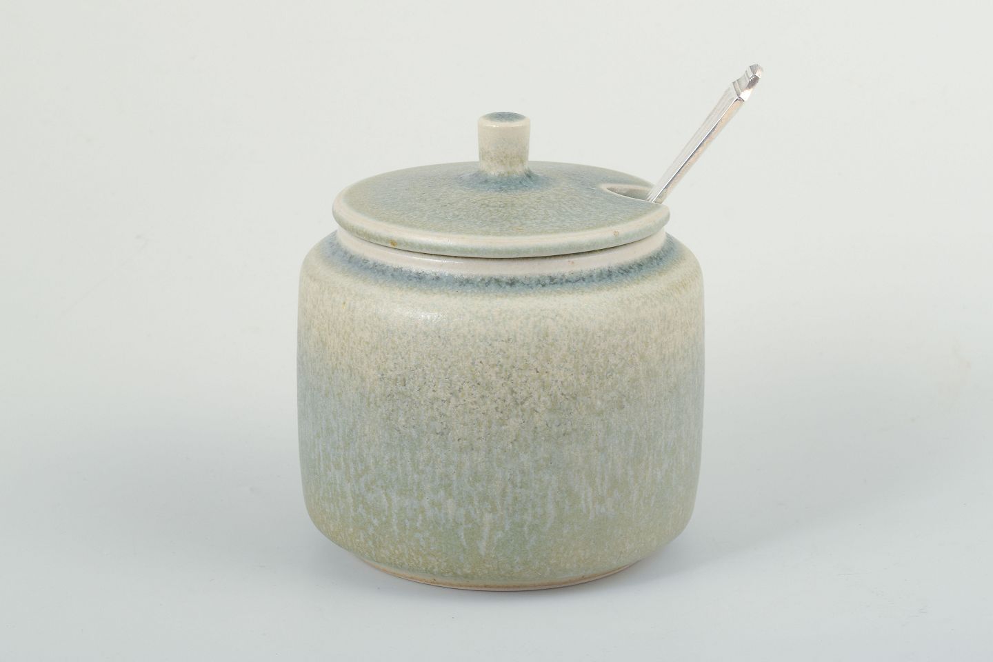 Cylindrisk marmeladekrukke i stentøj med låg. Glasur i afdæmpede grøn-blå nuancer med diskret løbende effekt. Medfølgende ske i sterling sølv, stemplet Hans Hansen. Bunden med indridset mærke “Palshus Denmark” samt modelangivelse.