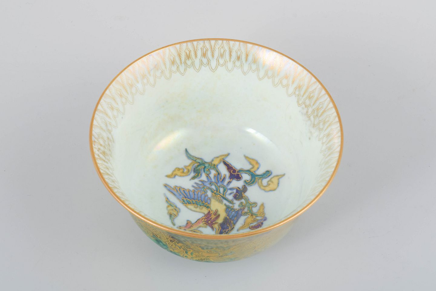 En karakterfuld og eftertragtet skål fra Daisy Makeig-Jones’ berømte ”Fairyland” og Lustre Ware-produktion for Wedgwood, hvor orientalske motiver og rige farver forenes med luksuriøs forgyldning.