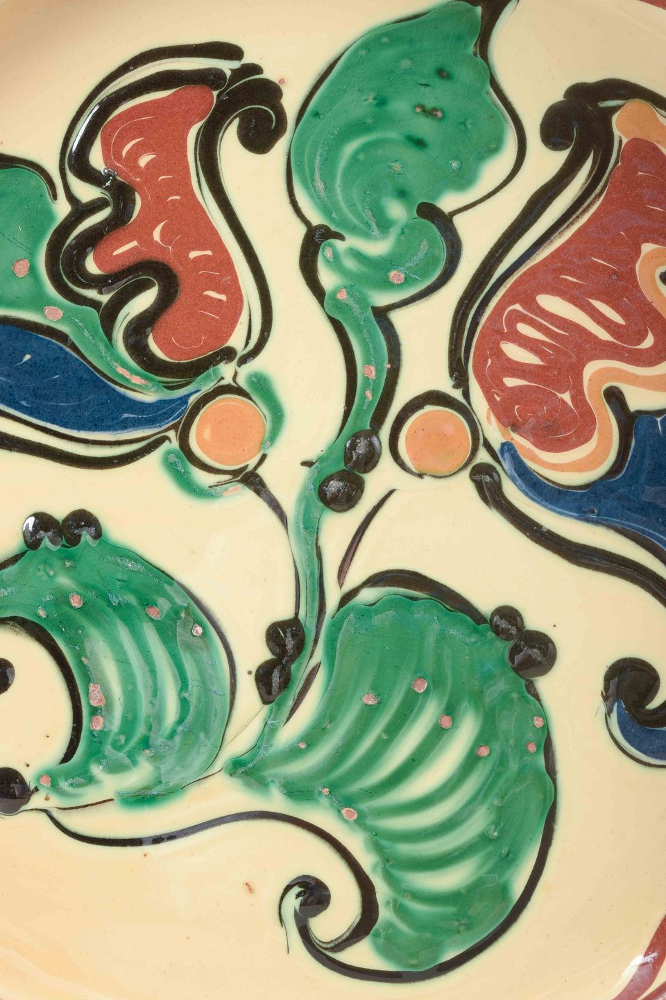 Et dekorativt værk fra Kählers værksted, hvor kraftige farver og organiske ornamenter forenes i et stiludtryk, der kombinerer traditionel keramik med periodens dekorative modernisme.