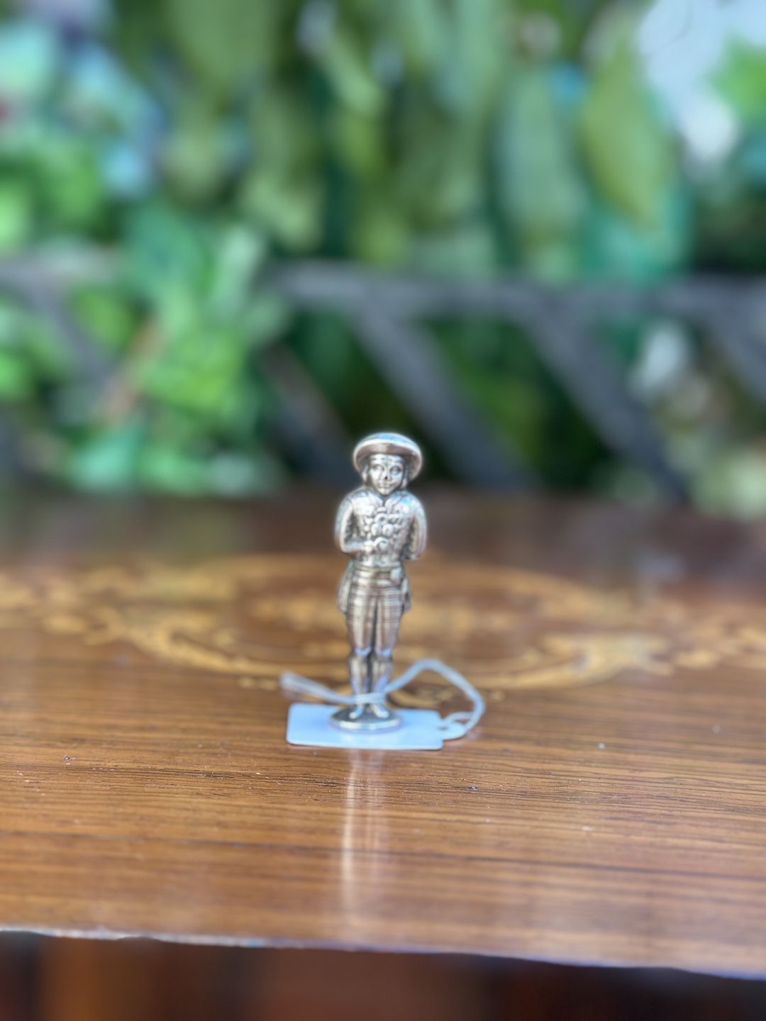 Vintage nålebeholder i sølv , formen en lille figur ( mand i folkedragt , fra 1800 tallet