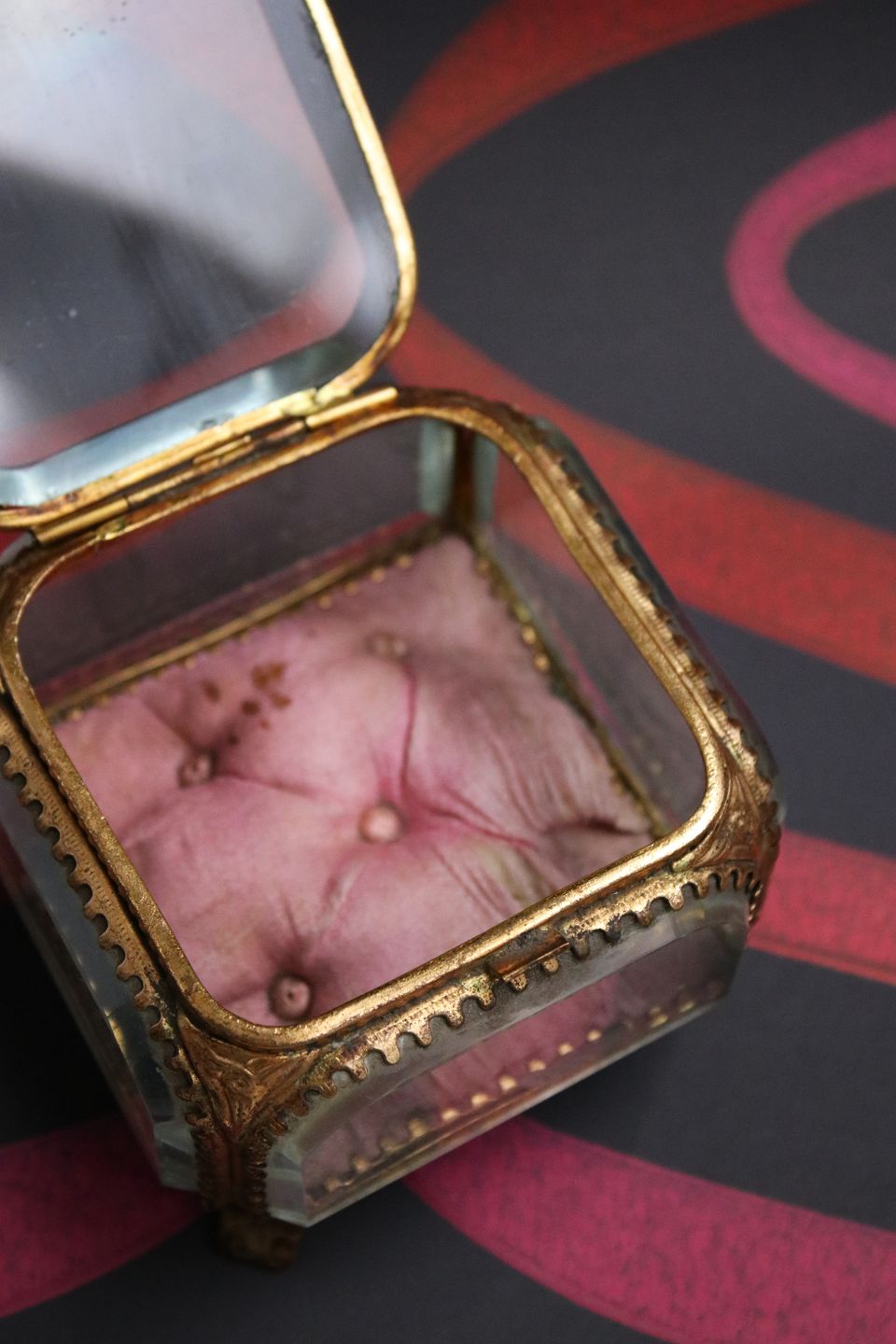 Antikt fransk smykkeskrin i bronze med facetslebne glas og silkepude i bunden...