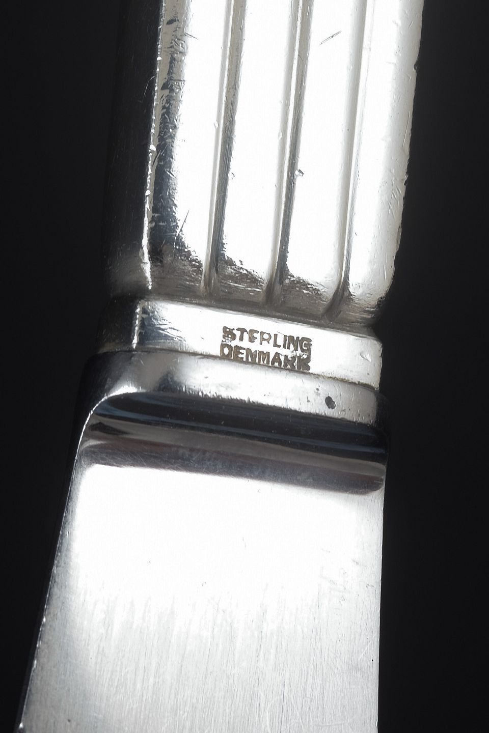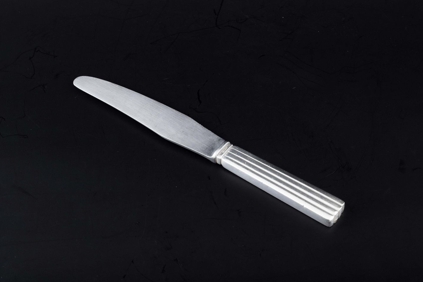 Frokostkniv i sterling sølv med blad i rustfrit stål i det ikoniske Bernadotte-mønster, designet af Sigvard Bernadotte. Det tidløse formsprog med parallelle rifler i skaftet gør bestikket til et af Georg Jensens mest populære og klassiske designs.