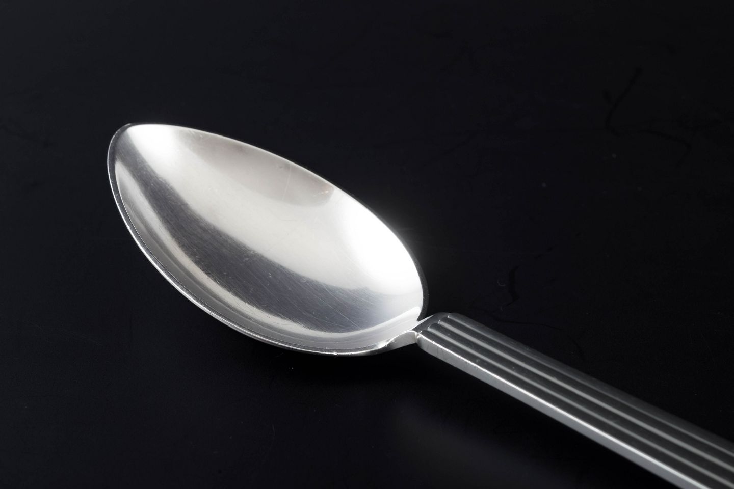 Stor middagsske i sterling sølv i det ikoniske Bernadotte-mønster, designet af Sigvard Bernadotte. Det tidløse formsprog med parallelle rifler i skaftet gør bestikket til et af Georg Jensens mest populære og klassiske designs.