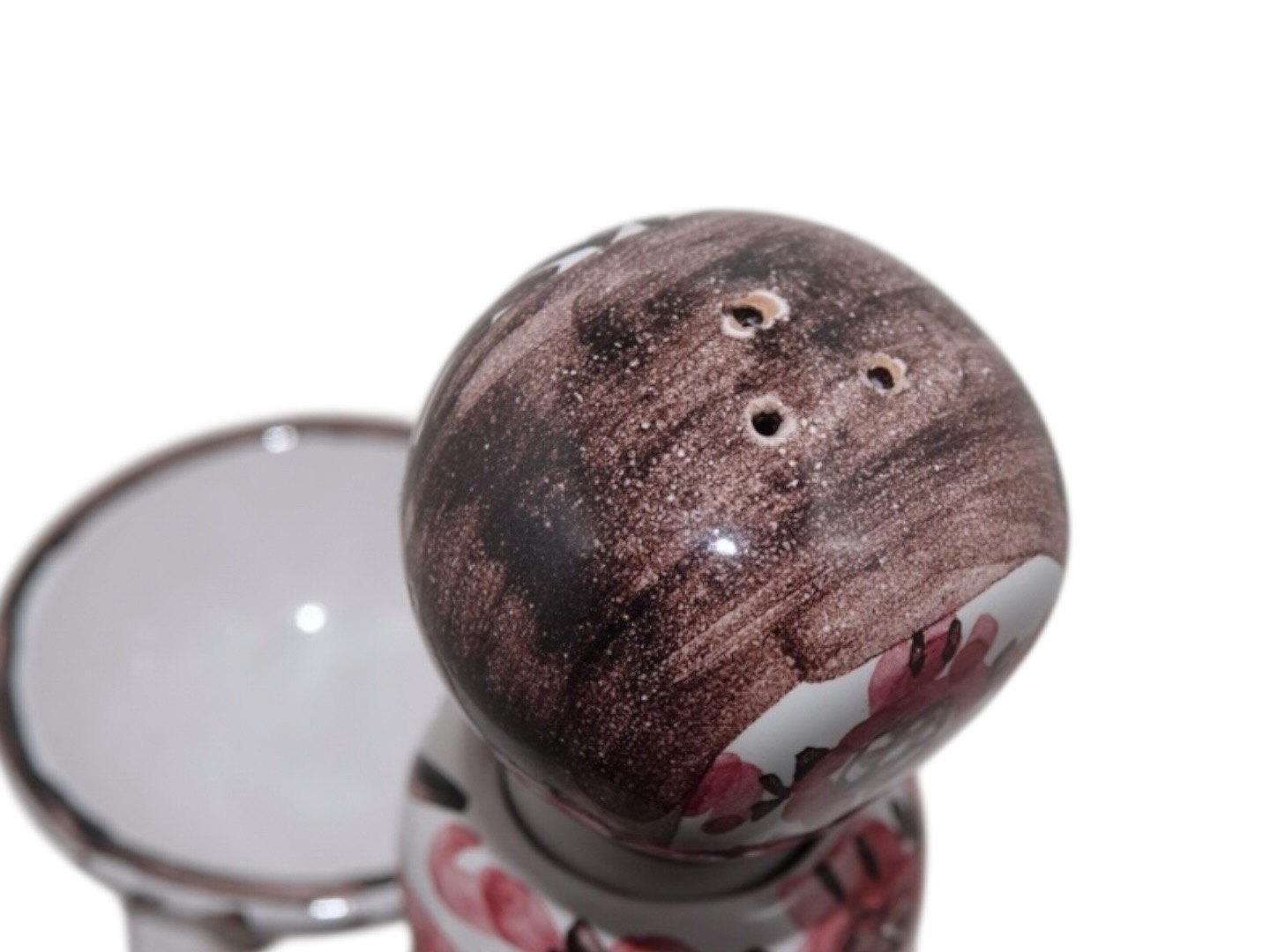 Der er et glasurskrab ved det ene hul til peberbøssen i toppen, se foto, ellers fejlfri stand.