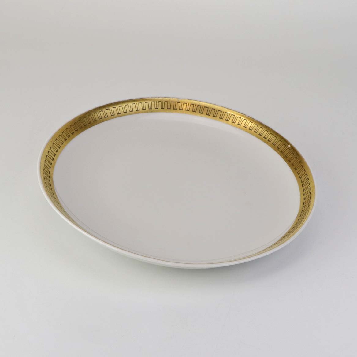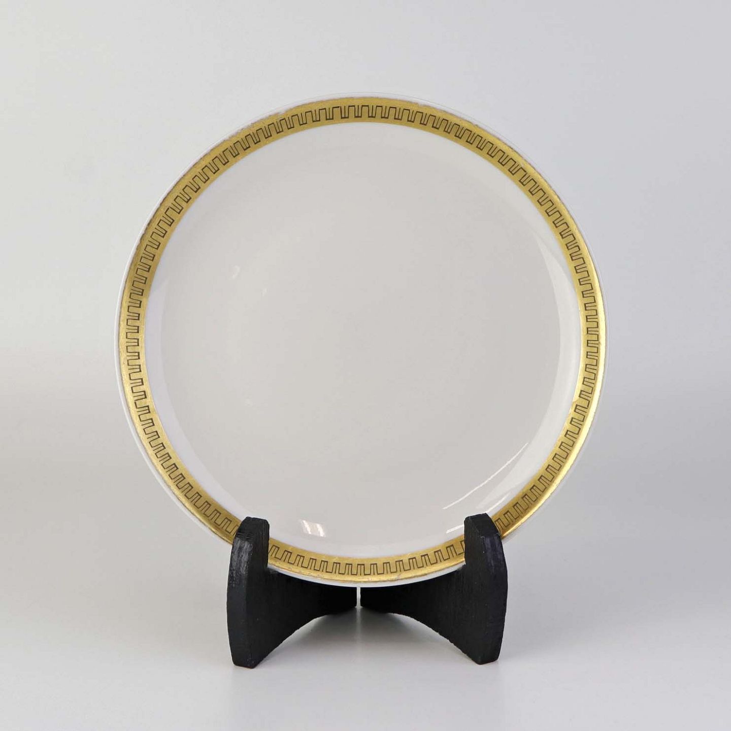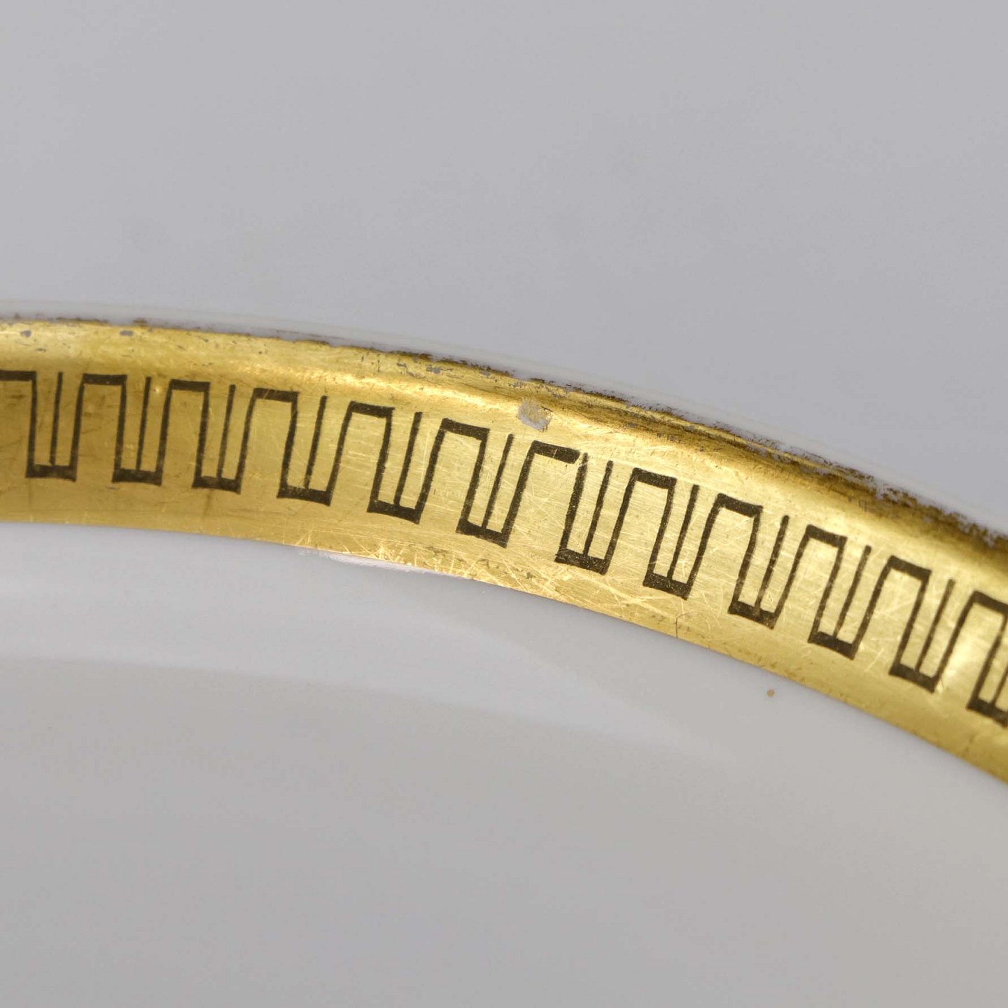 Stel i glat hvidt porcelæn dekoreret med sort streg i guldbort.