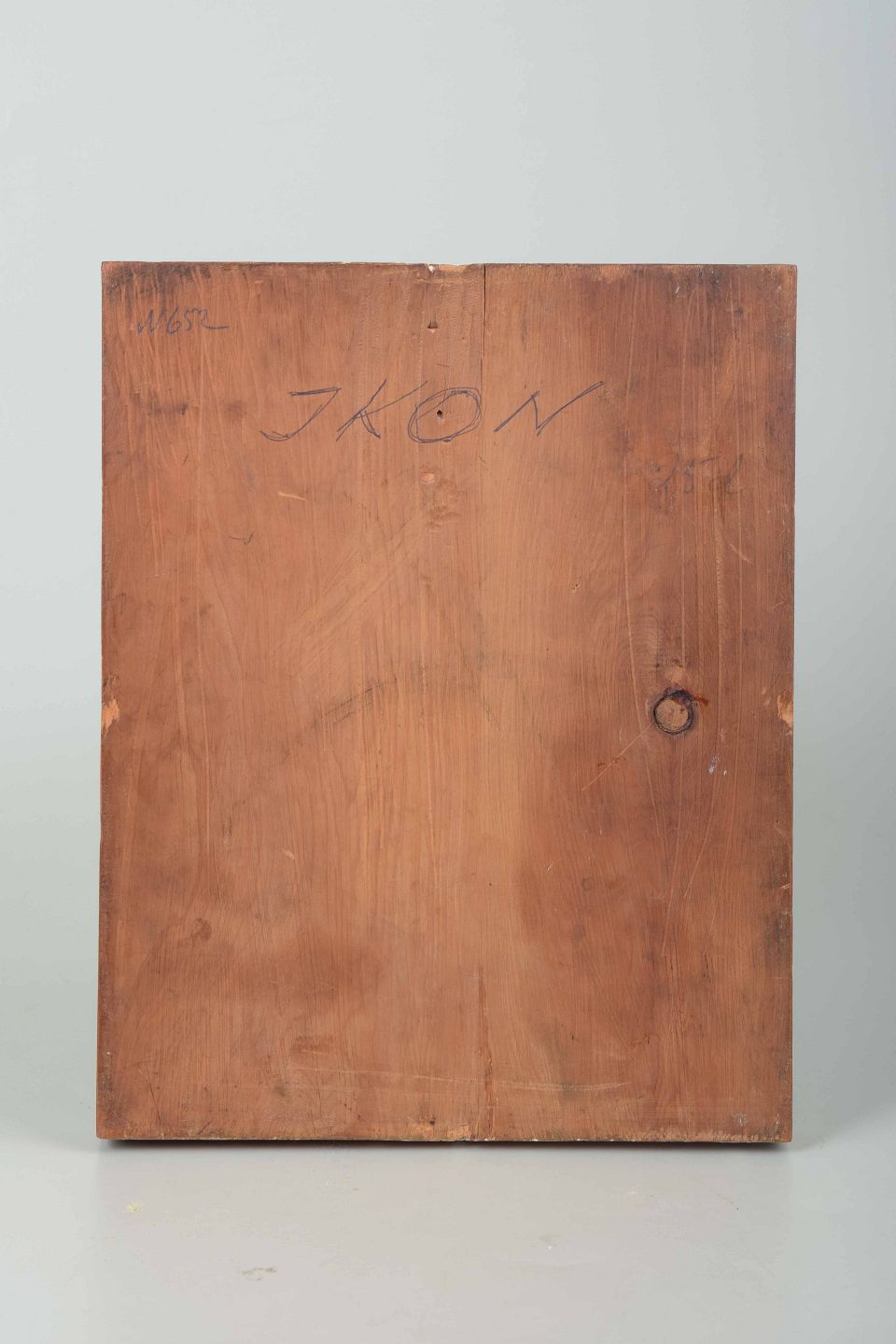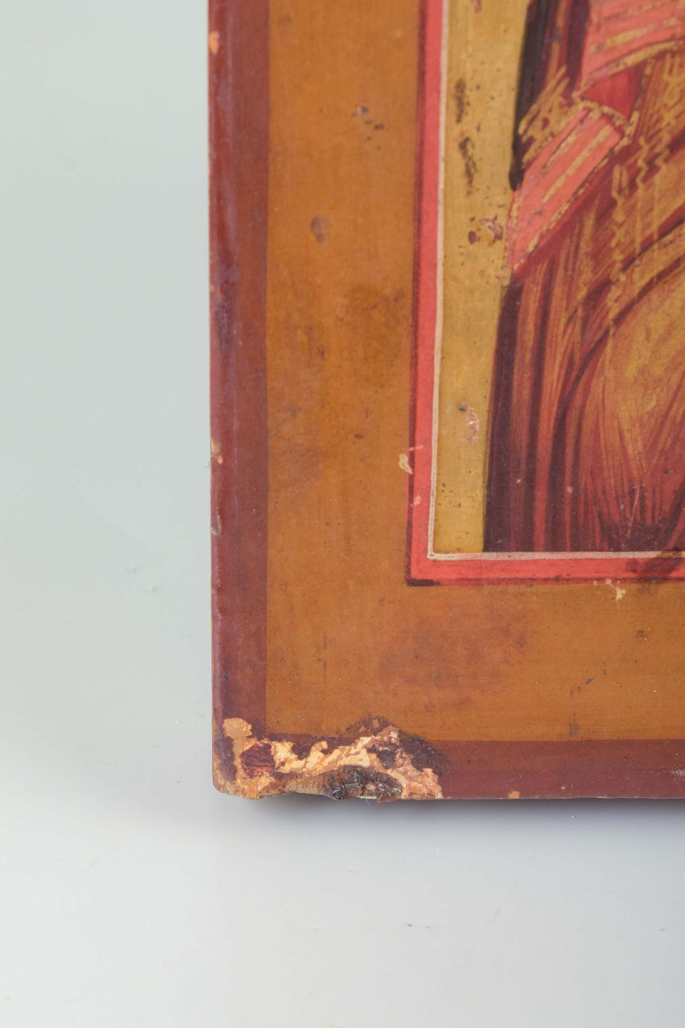 Rektangulær ikonmaleri på træplade, udført i tempera på forgyldt bund. Fremstilling af Gudsmoder med Barnet Kristus (Hodegetria-type), begge med glorier. Med inskriptioner i kirke-slavisk.
