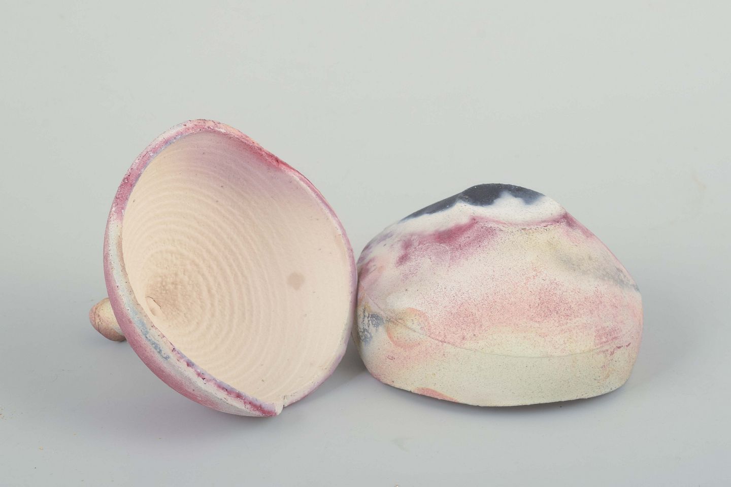 Organisk formet lågkrukke i drejet stentøj med rå overflade og flerfarvet glasur i rosa, hvide og sorte toner.