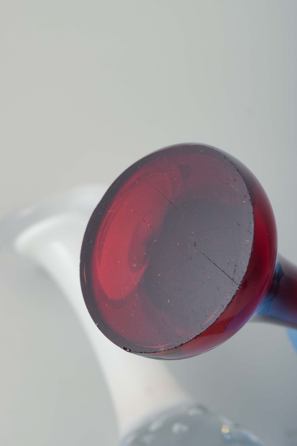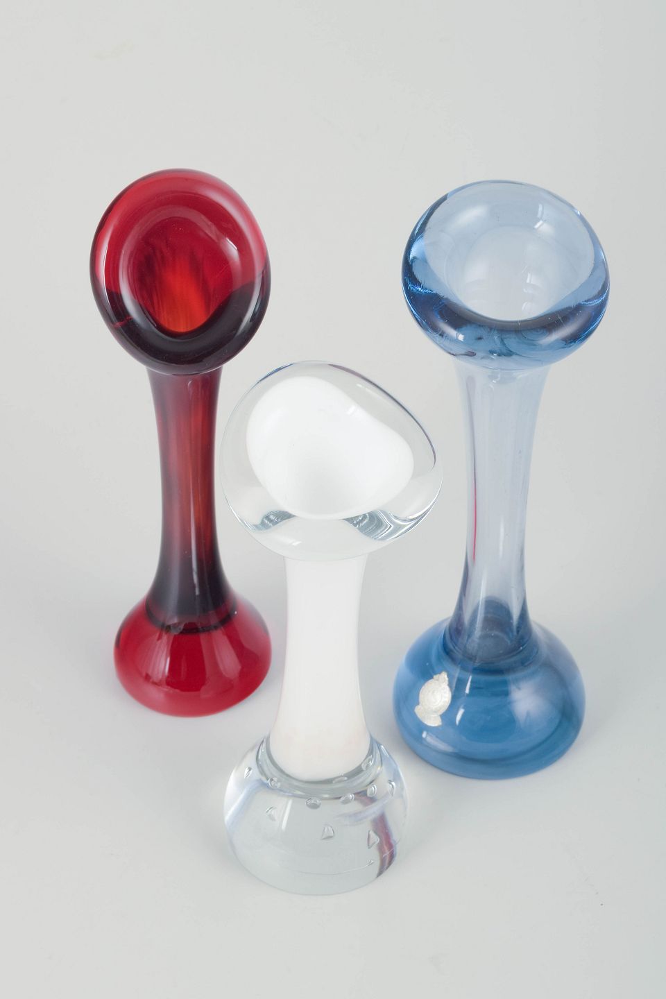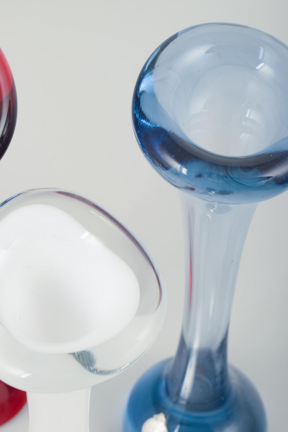 Mundblæst glas i farverne rød, blå og opal-hvid.