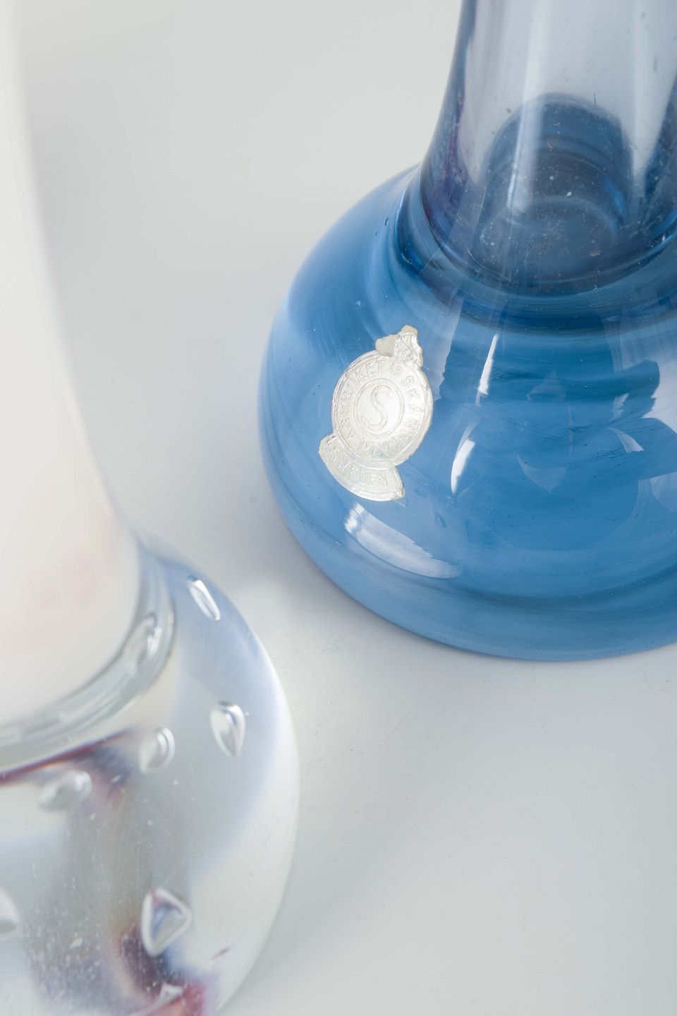 Et sæt skulpturelle glasvaser fra henholdsvis Mantorp Glasbruk og Skånska Glasbruket, Sverige, fremstillet ca. 1969. Vaserne er kendetegnet ved den tunge fod, den slanke hals og den organiske åbning i dråbeform. Klassiske eksempler på skandinavisk glaskunst fra perioden.