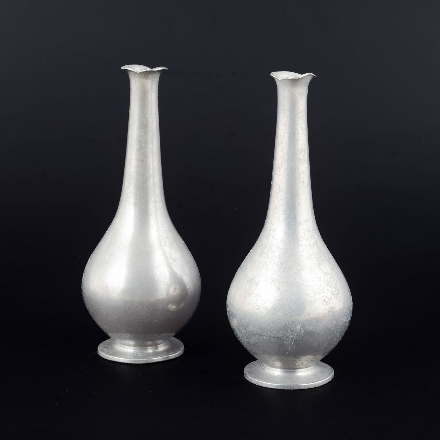 Slanke vaser i støbt tin med rund fod, dråbeformet korpus og smal hals afsluttet i bølget, udadbøjet rand. Begge mærket JUST i trekant, Denmark samt modelnummer 1457.