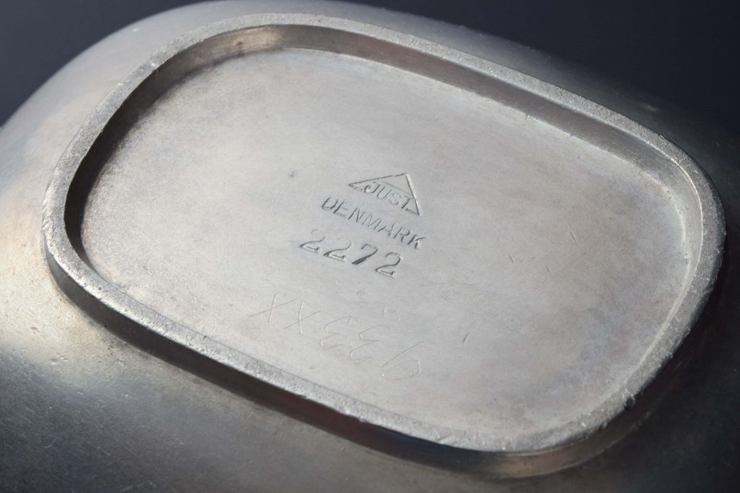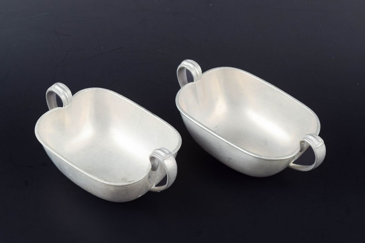 Et par elegante serveringsskåle fra Just Andersen, udført i tin. De bløde, stramme former og de karakteristiske hanke afspejler den danske art deco-stil, som Andersen blev internationalt berømt for.