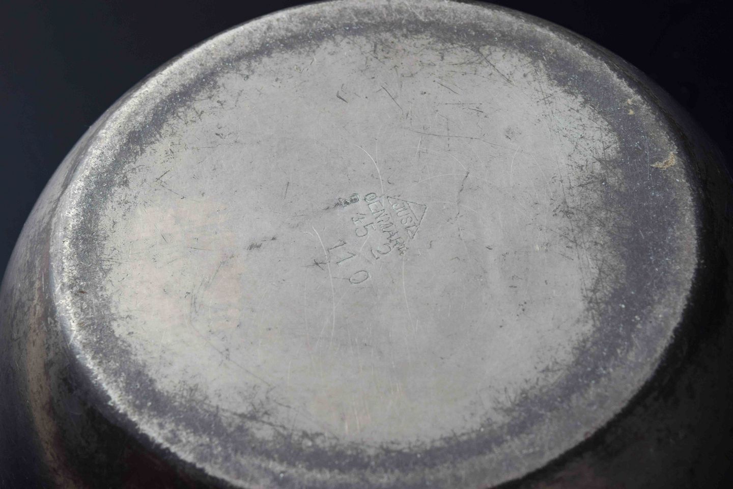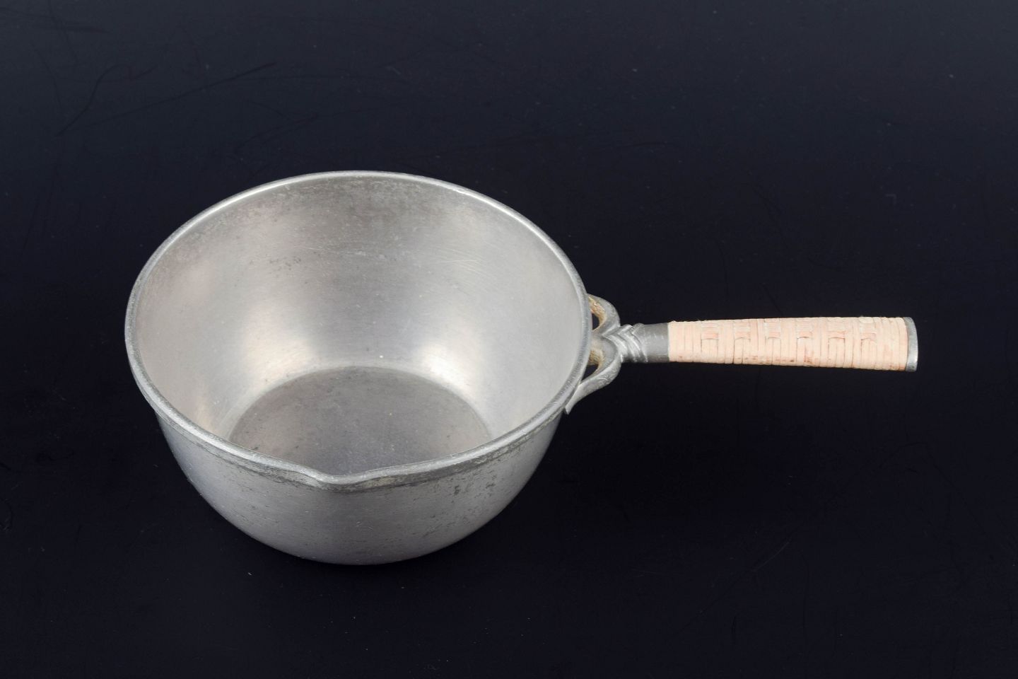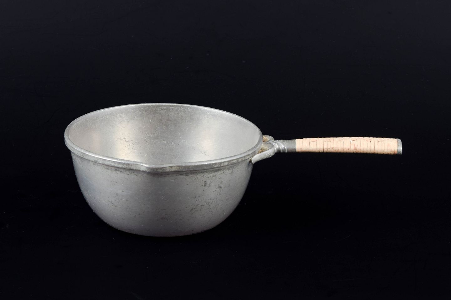 En funktionalistisk kasserolle af Just Andersen, udført i tin med det karakteristiske bambus håndtag