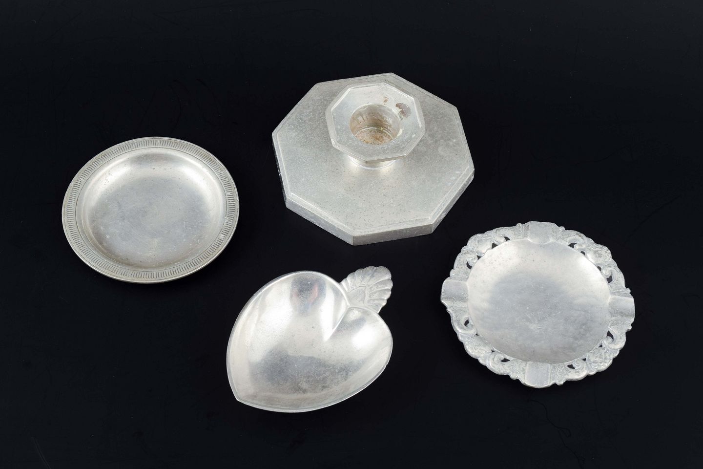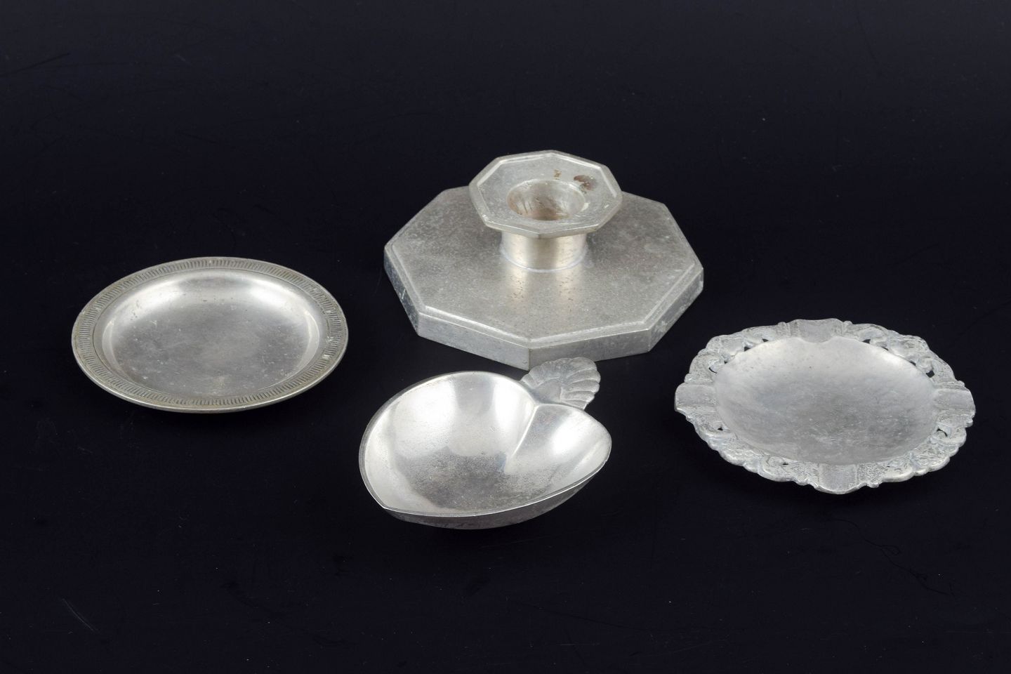 Samling af tre små skåle og en lysestage i tin, herunder en hjerteformet skål, en ottekantet lysestage samt en rund skål med gennembrudt kant. Én mærket med trekantet stempel "JUST" og modelnummer 231.